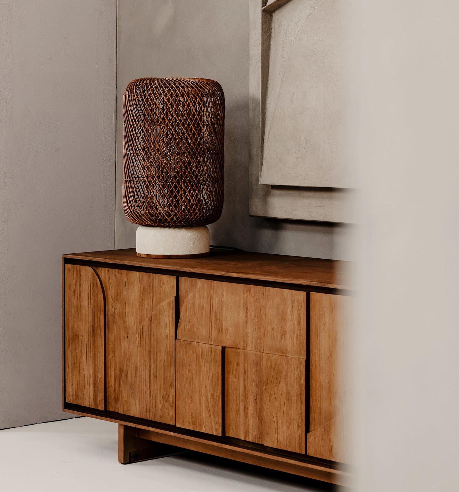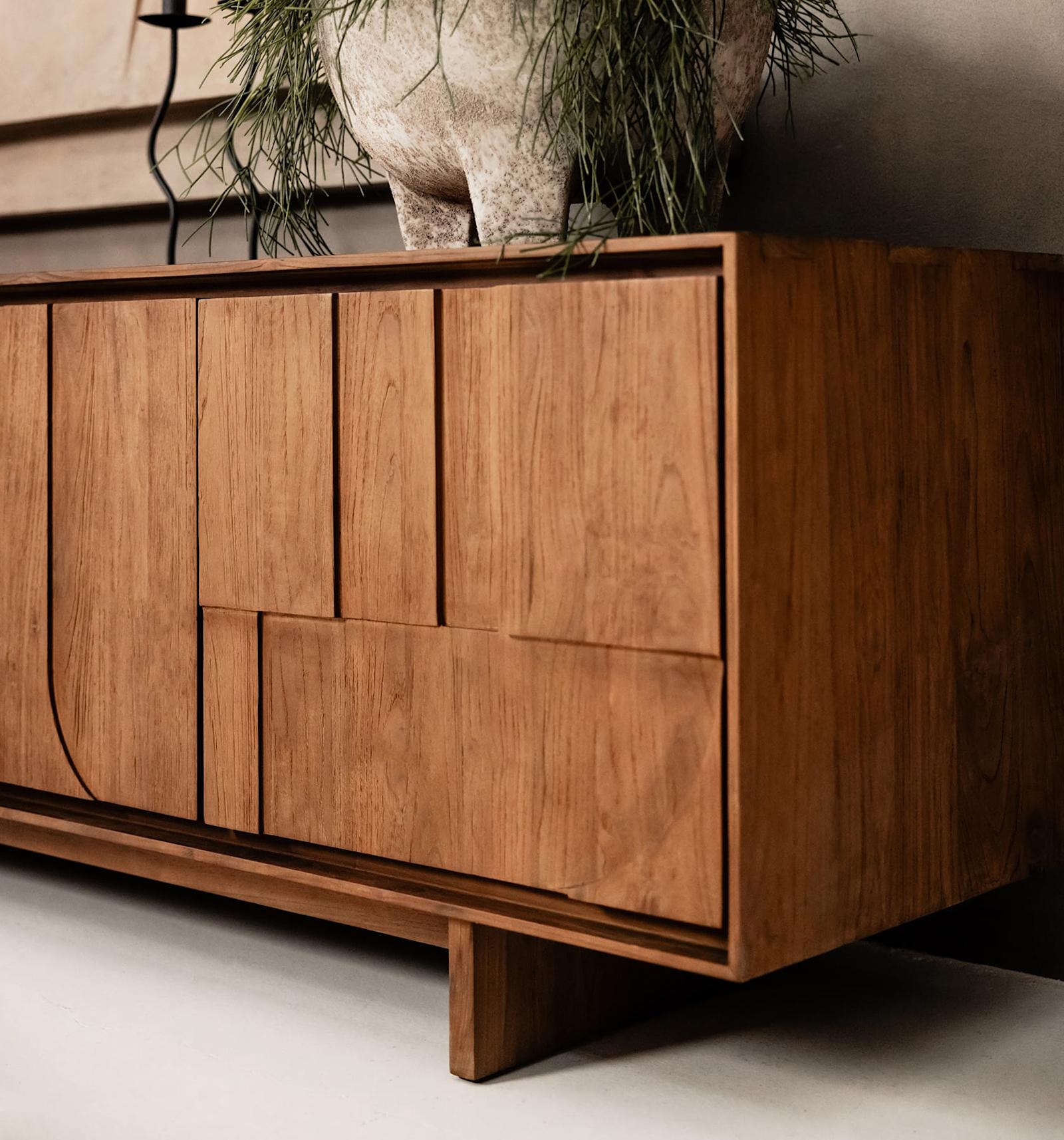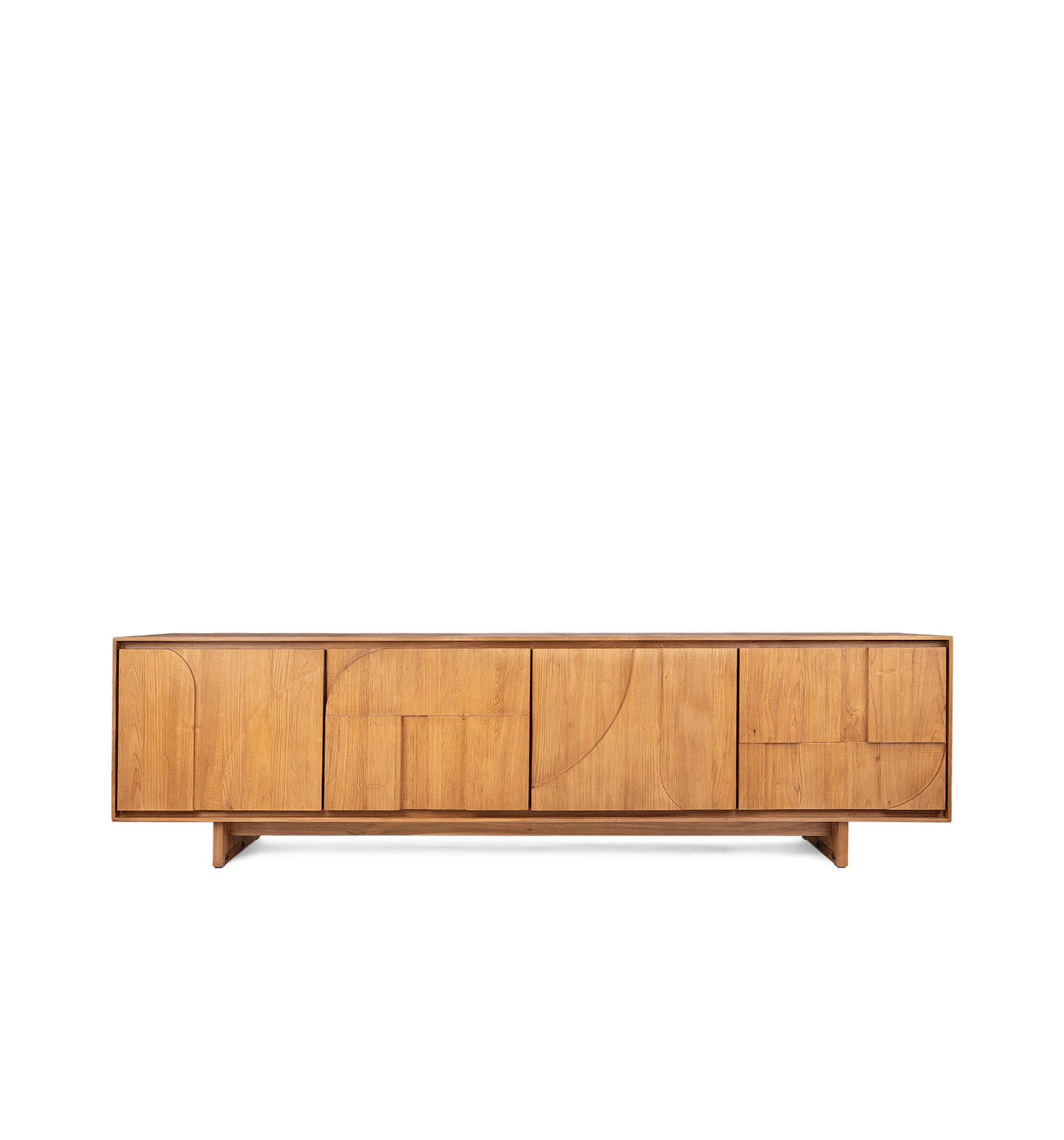 De Ace Dresser is een ware blikvanger, ontworpen om perfect aan te sluiten bij de Ace Artwork Cabinet. Met zijn 4 deuren in reliëf en 4 ruime planken biedt deze kast zowel functionaliteit als schoonheid. Het indrukwekkende grafische reliëf en het vakmanschap van gerecupereerd teak maken van dit meubelstuk een unieke toevoeging aan je interieur, die zowel als op zichzelf staand item als in combinatie met andere stukken prachtig tot zijn recht komt.