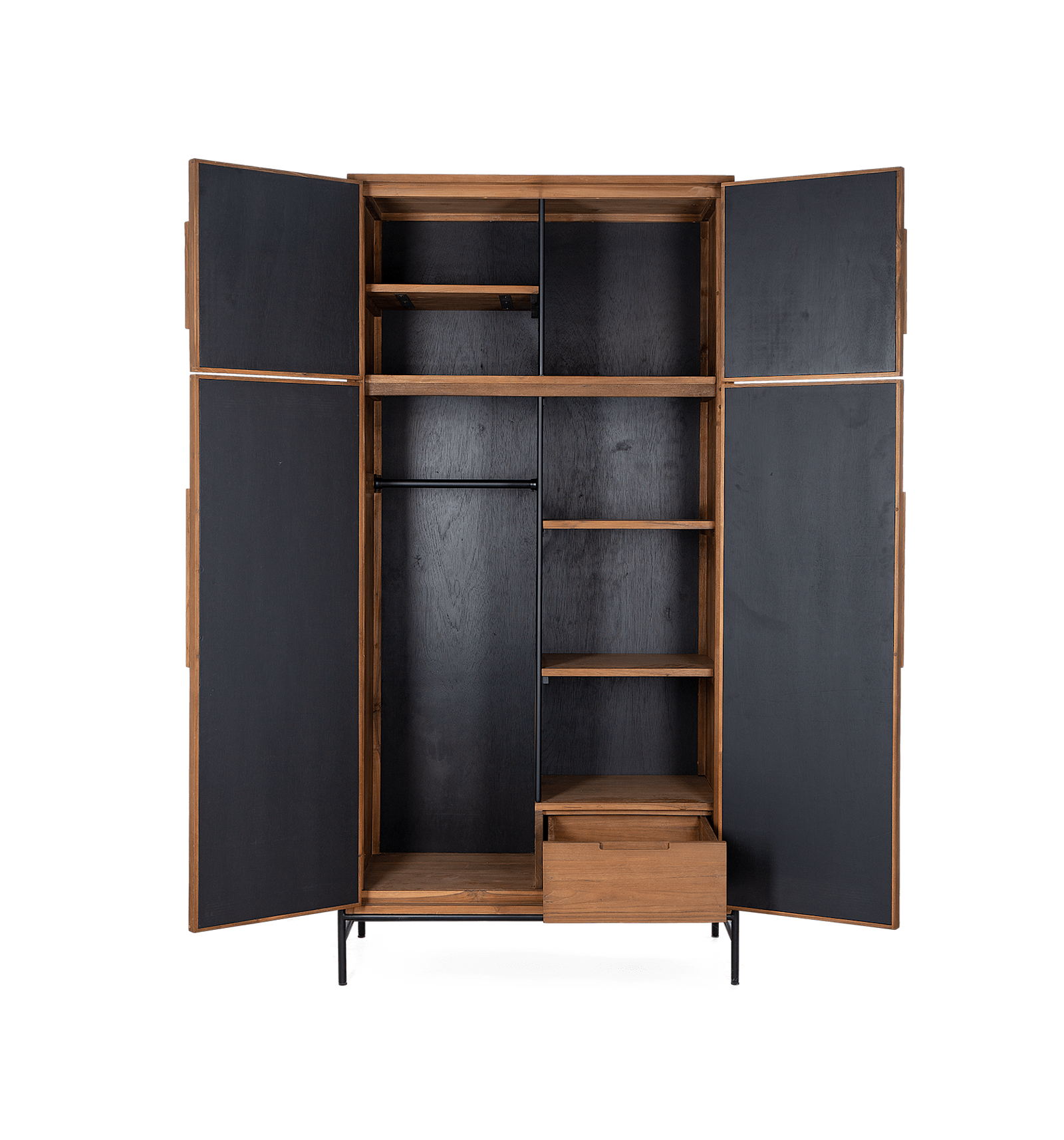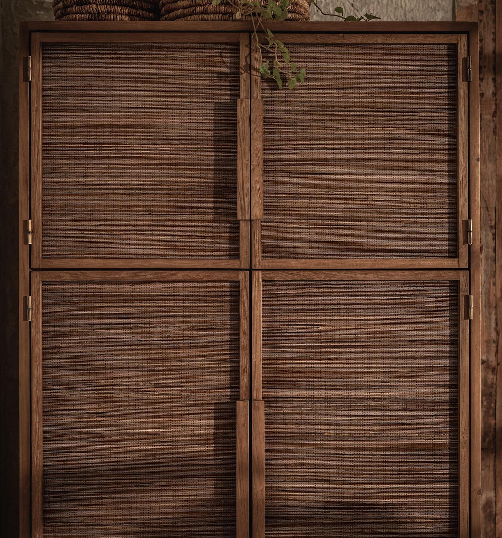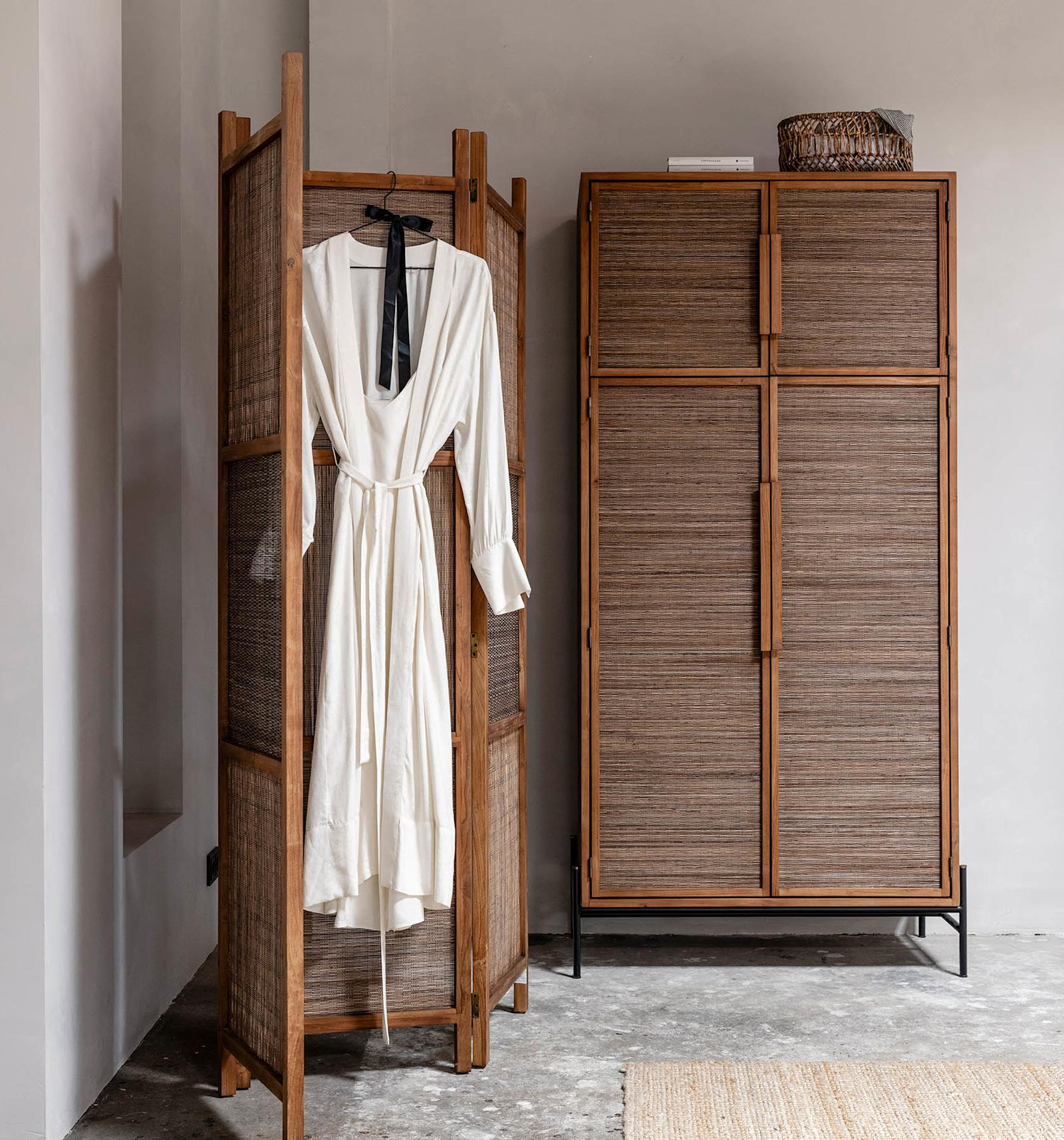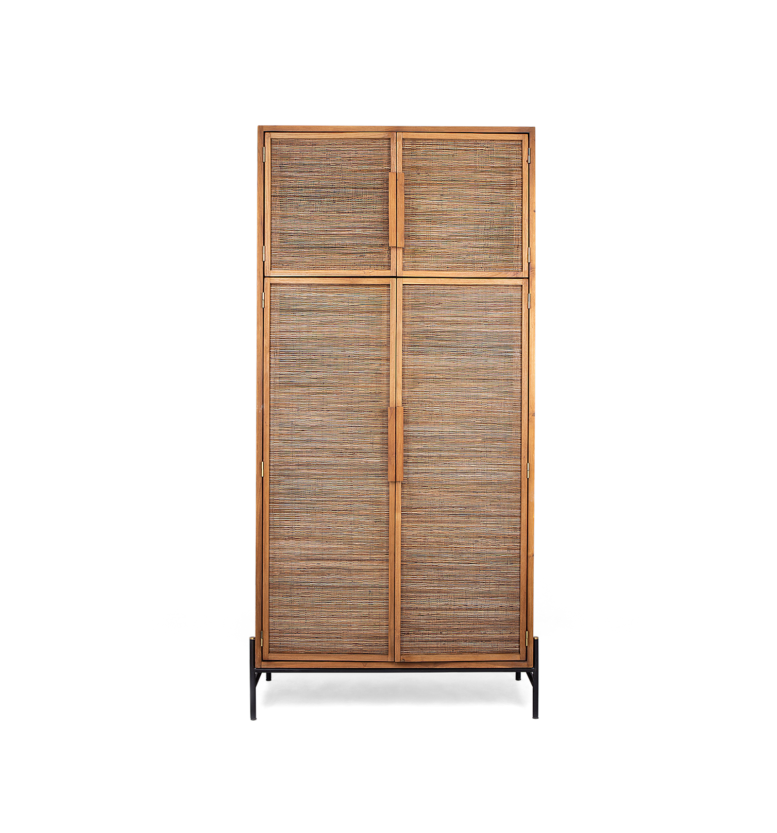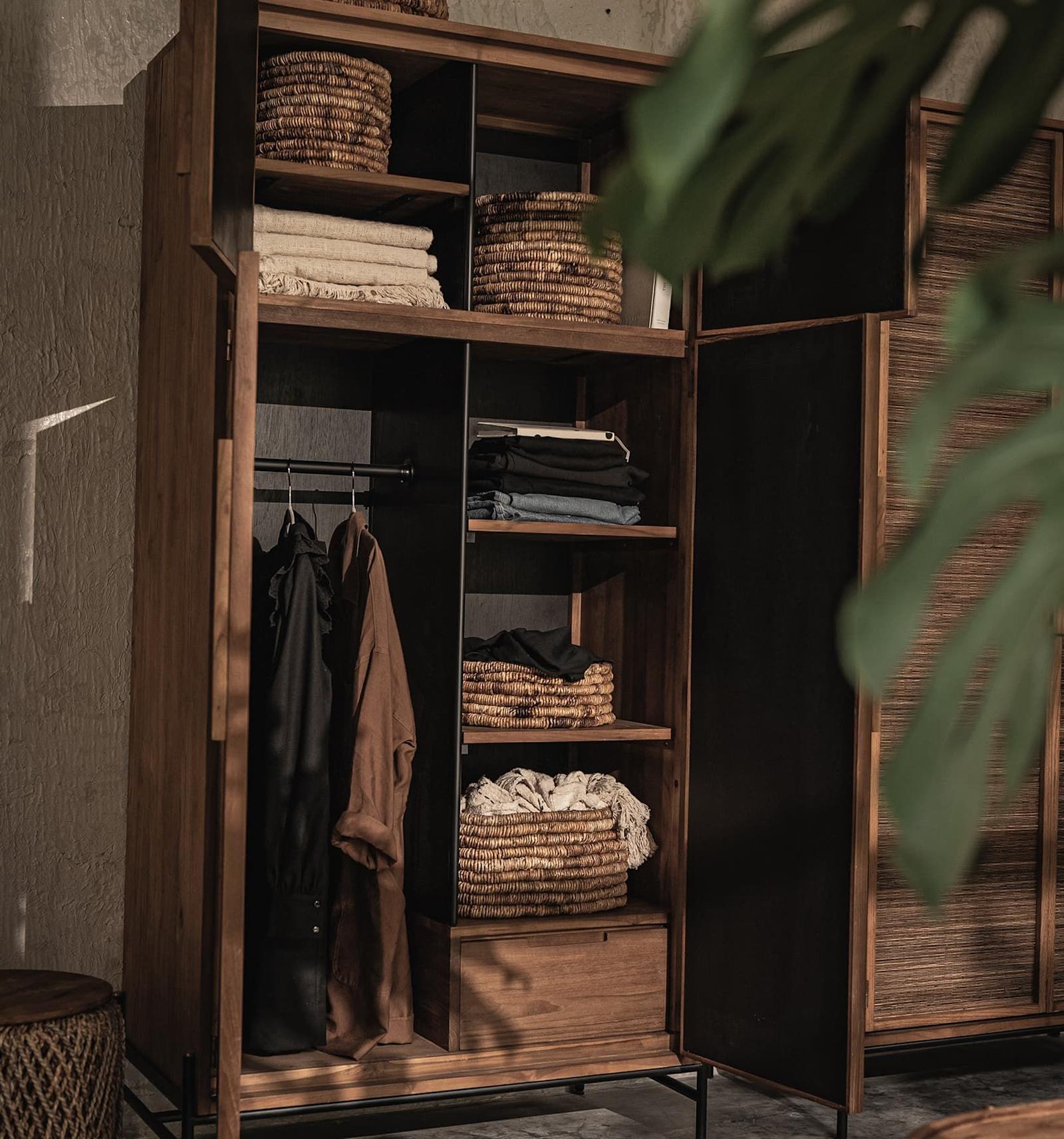De Coco Kast is een prachtig voorbeeld van vakmanschap, waar modern design en natuurlijke elementen perfect samenkomen. De handgemaakte deuren van verfijnde kokosnootweving en het robuuste frame van gerecycled teakhout en ijzer zorgen voor een unieke en stijlvolle uitstraling. Bij het openen van de vier deuren vindt u vier ruime planken en een binnenlade, ideaal om uw spullen georganiseerd en binnen handbereik te houden. Bovendien zijn de hangers perfect voor het netjes ophangen van uw kleding. De Coco Kast is niet alleen een praktische oplossing voor uw opbergruimte, maar ook een statement van luxe en duurzaamheid in uw interieur.