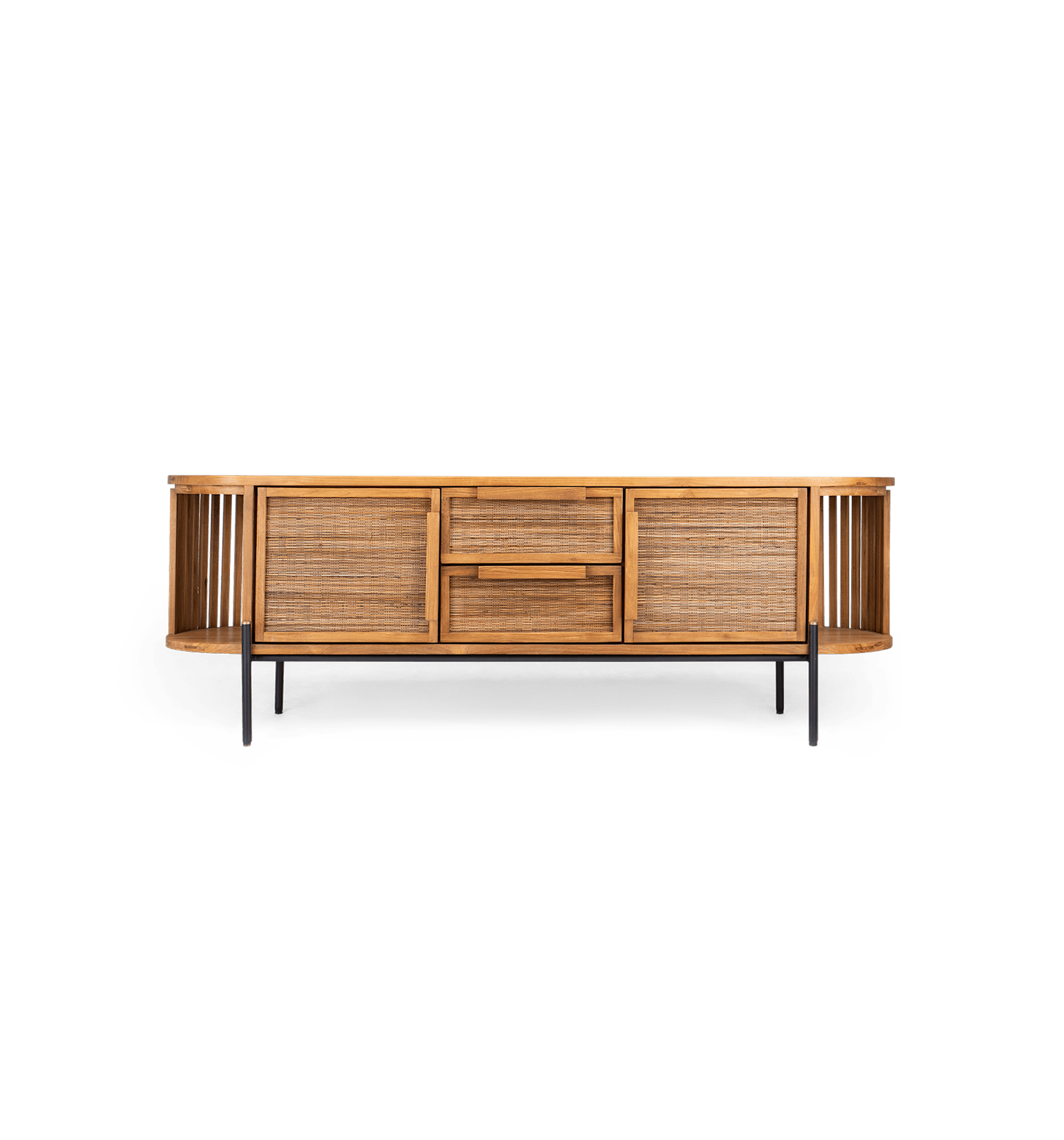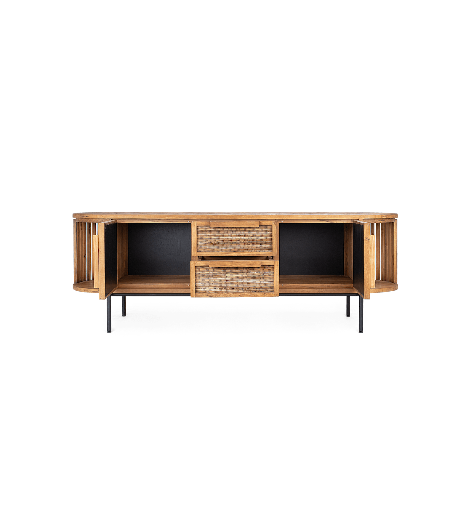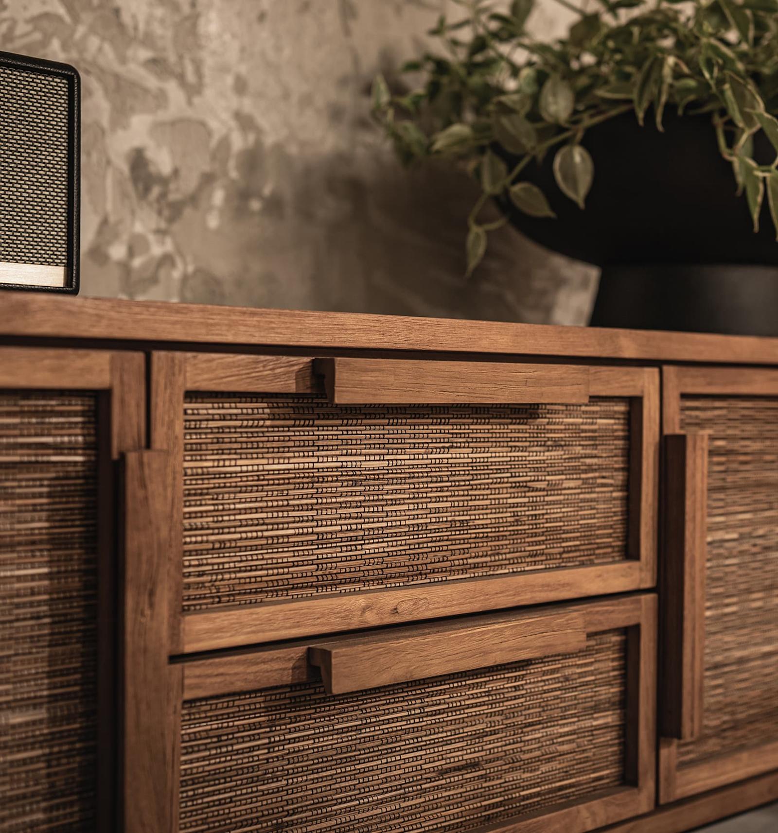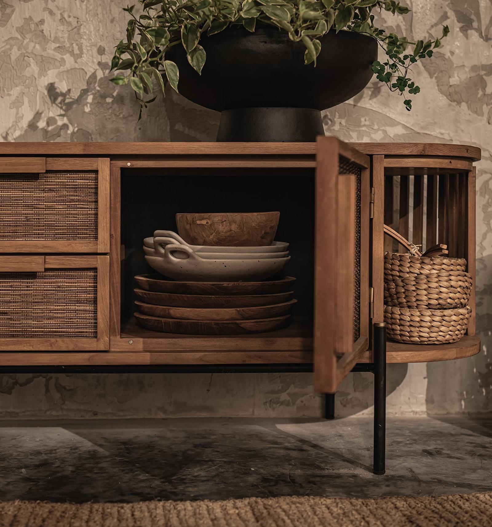 Het Coco Dressoir is een adembenemend mooi kunstwerk van vakmanschap dat meteen de aandacht trekt. Gemaakt van gerecycled teakhout, robuust ijzer en handgemaakte weefsels van de middennerf van kokosnootpalmblaadjes, combineert het natuurlijke elementen met verfijnd design. Het subtiele hoekdetail in het houten frame voegt een extra elegantie toe, waardoor het dressoir niet alleen een praktische opbergoplossing is, maar ook een uniek statement in uw interieur. Dit is een stuk dat zowel charme als functionaliteit brengt, perfect voor wie op zoek is naar een tijdloze toevoeging aan zijn ruimte.