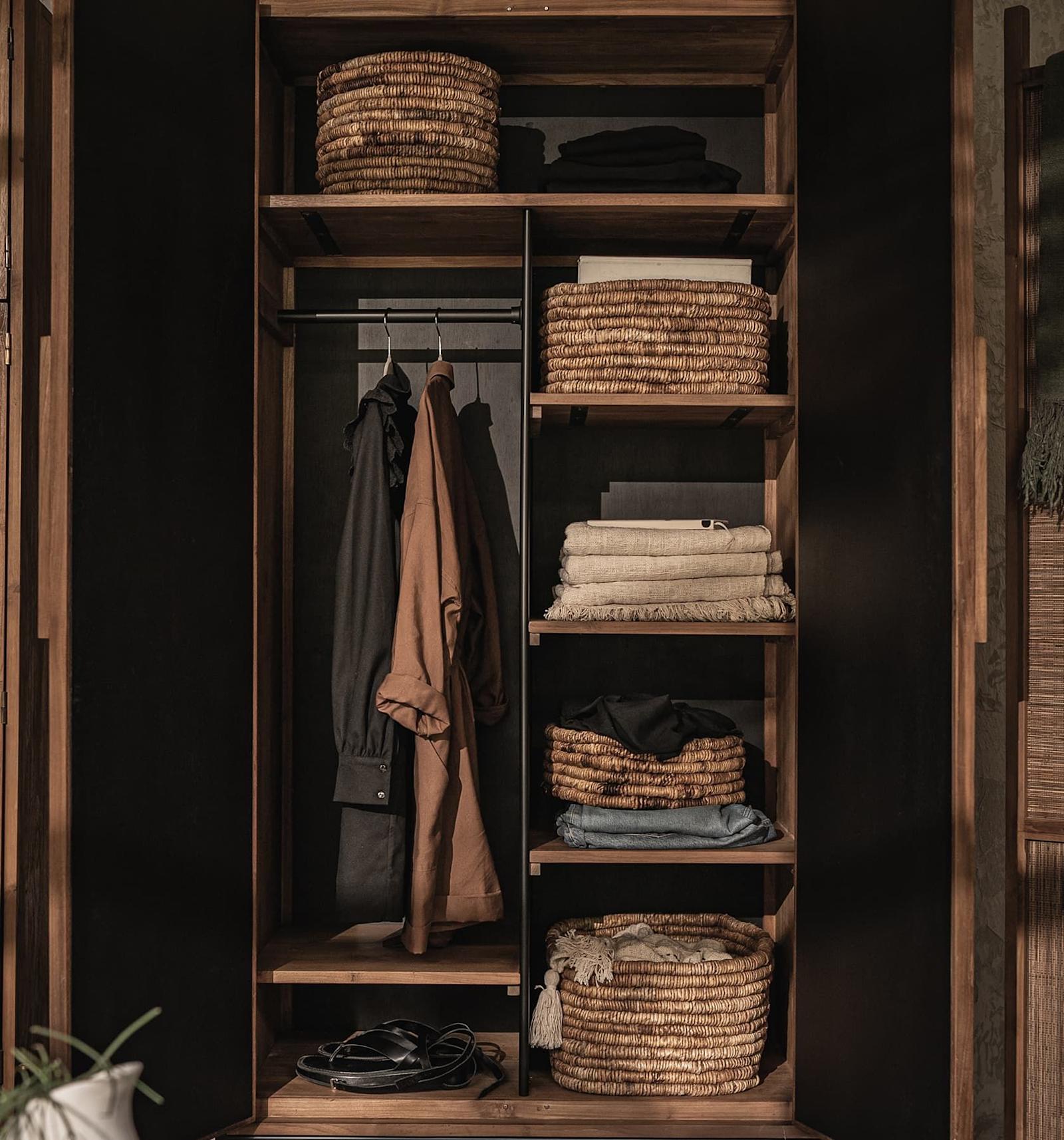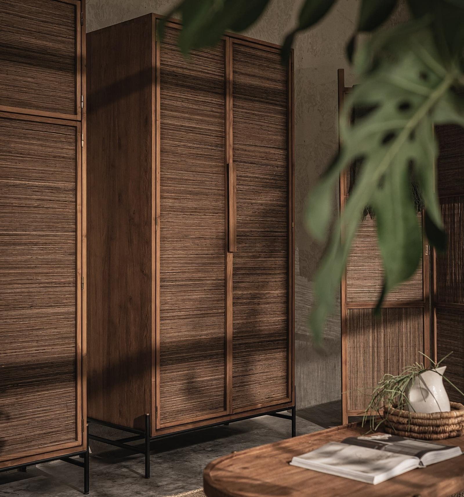 De Coco Kast is een meesterwerk van vakmanschap, een stijlvolle en moderne toevoeging aan elk interieur. Met handgemaakte deuren van verfijnde kokosnootweving en een robuust frame van gerecycled teakhout en ijzer, straalt deze kast een unieke, natuurlijke charme uit. Bij het openen van de twee deuren komt u vijf praktische planken tegen om uw spullen perfect georganiseerd te houden, terwijl de hangers uw kleding netjes en geordend bewaren. De Coco Kast is niet alleen een functionele oplossing voor uw opslagbehoeften, maar ook een statement van luxe en duurzaamheid in uw woonruimte.