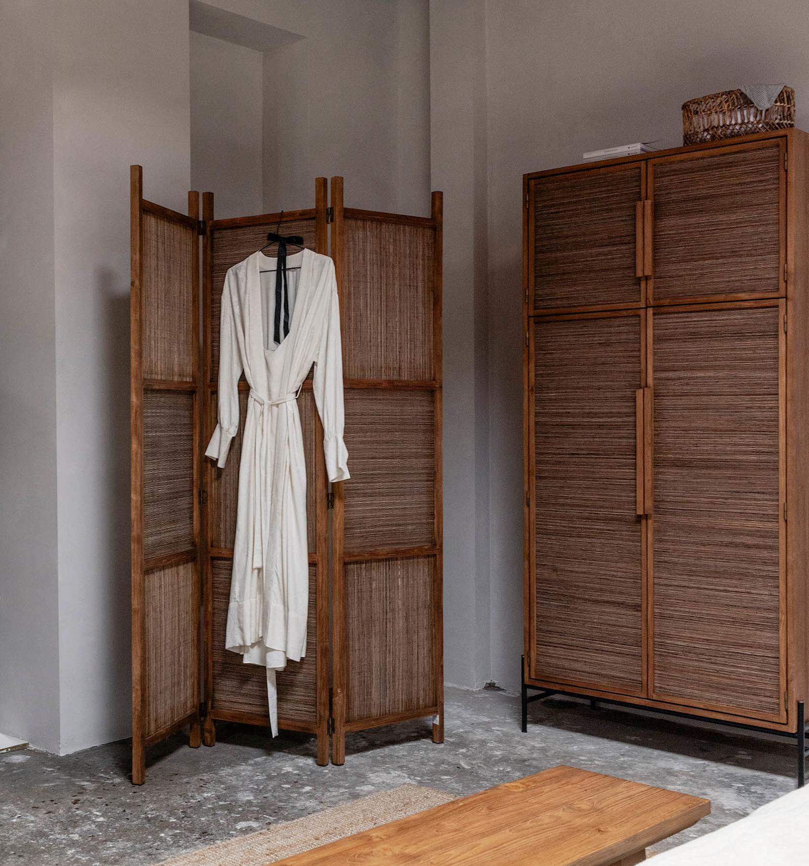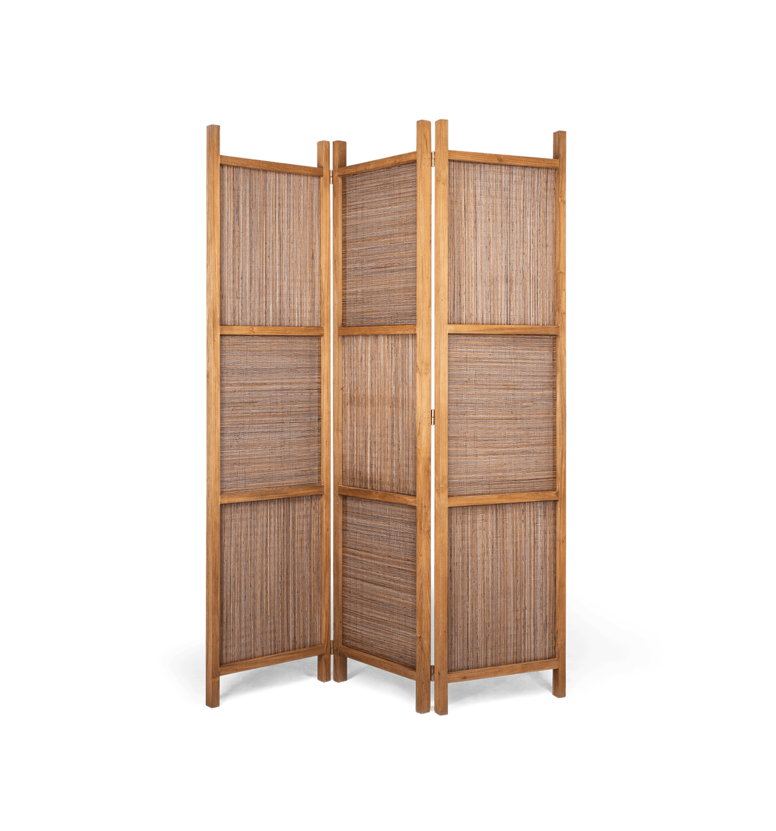 Wie had gedacht dat roomdividers/kamerverdelers zo'n stijlvolle en luxueuze toevoeging aan je interieur konden zijn? Deze divider, met een frame van hoogwaardig gerecycled teakhout, wordt gecombineerd met prachtig handgemaakte, gedetailleerde geweven deuren van de middennerf van kokosnootpalmblaadjes. Het resultaat is een uniek stuk dat niet alleen functioneel is, maar ook een rijke textuur en natuurlijke charme aan je ruimte toevoegt. Een perfecte manier om je interieur te verfraaien en tegelijkertijd praktische afscheidingen te creëren.