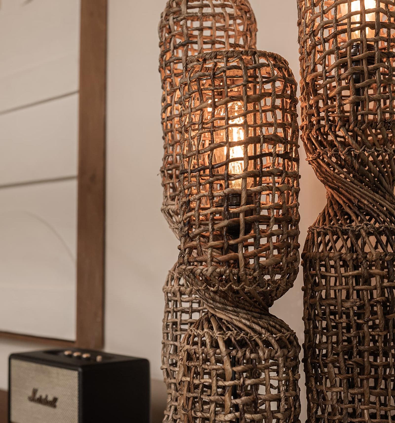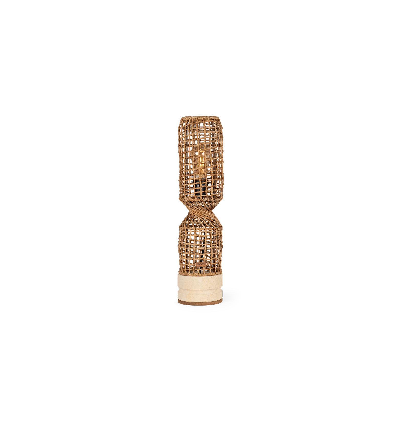De Twister tafellampen zijn een unieke en verfijnde toevoeging aan elk interieur. Het ontwerp, geïnspireerd door een 'vissentrap', combineert een stevig metalen frame met vakkundig gewikkelde Abaca-schors, waardoor een rustieke en toch elegante geweven uitstraling ontstaat. De lampen zijn kunstzinnig gedraaid, met stijlvolle "draaidetails" die de lamp een speelse charme geven. Ze rusten op een robuuste, handgedraaide zandstenen basis, die niet alleen zorgt voor stabiliteit, maar ook voor een vleugje natuurlijke schoonheid. Deze lampen brengen sfeer, veiligheid en stijl in elke ruimte.