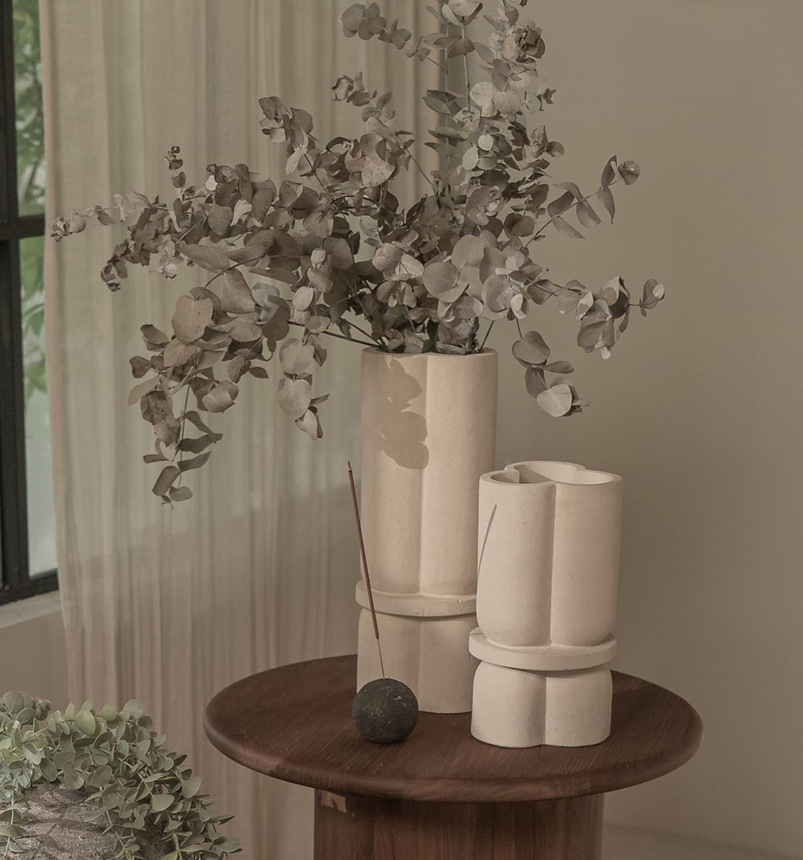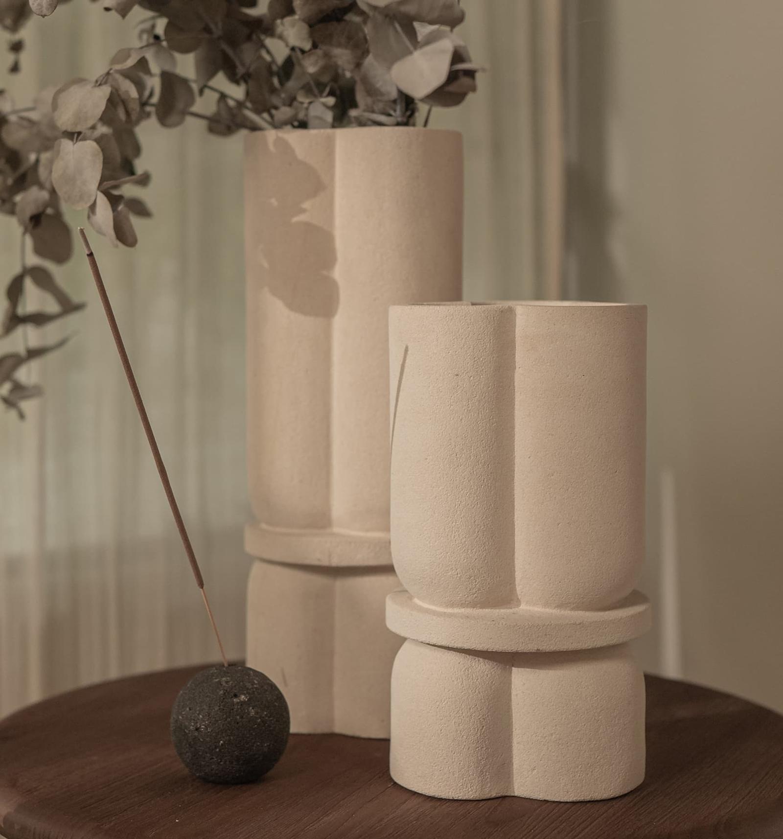 De Cap Vazen-serie is een schitterend voorbeeld van uniek vakmanschap, met vormen die geïnspireerd zijn op het iconische dBodhi-logo. Elke vaas heeft de verfijnde 'Trefoil'-vorm, bestaande uit drie in elkaar grijpende cilinders, wat zorgt voor een elegante en opvallende uitstraling. Handgemaakt van lokaal Javaans zandsteen, heeft elke vaas een unieke kleur dankzij de delicate aderen in de steen, variërend van zachte tinten tot diepe nuances. Deze vazen zijn niet alleen functionele objecten, maar ook kunstwerken die een luxe en natuurlijke charme aan elk interieur toevoegen.