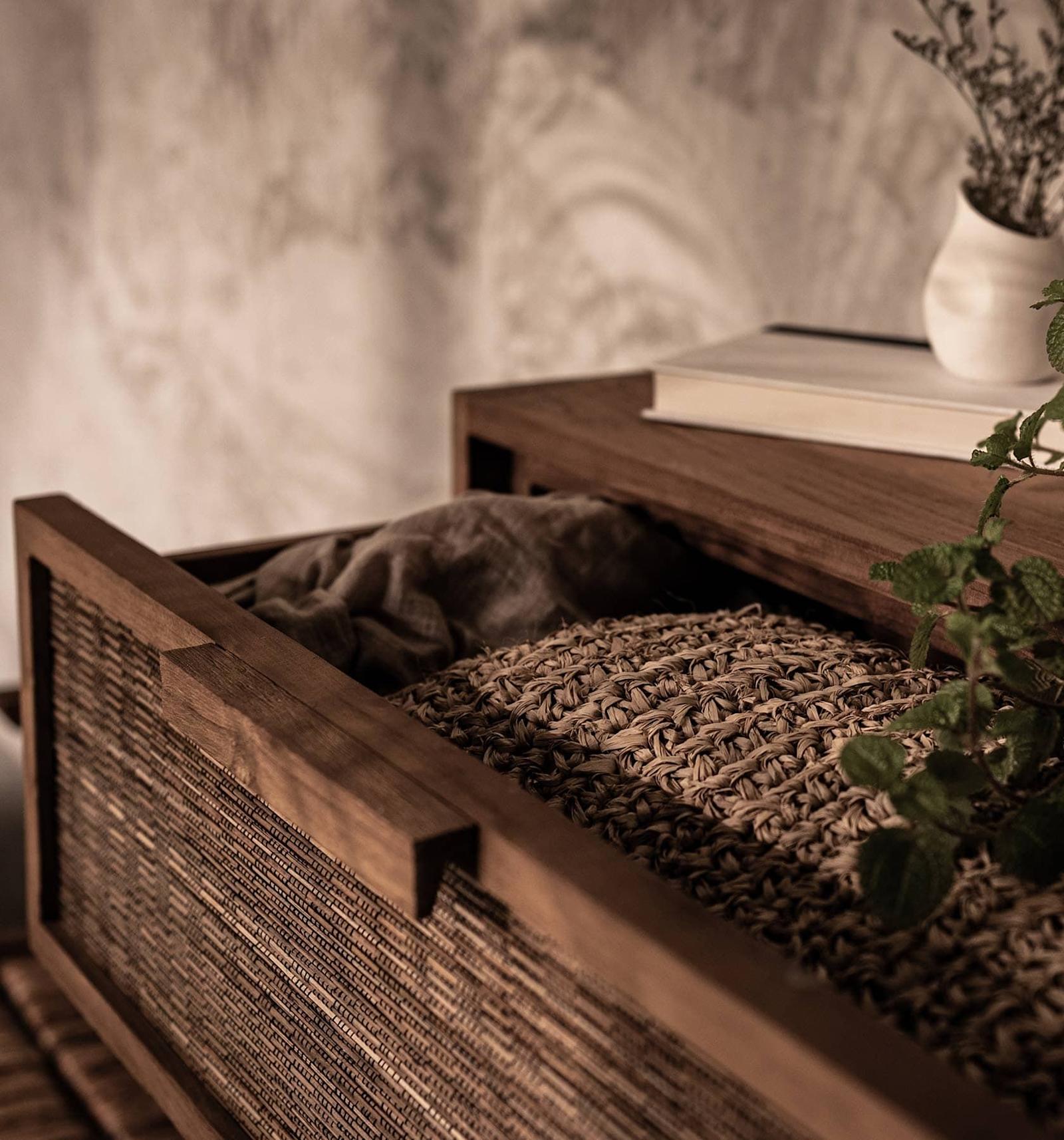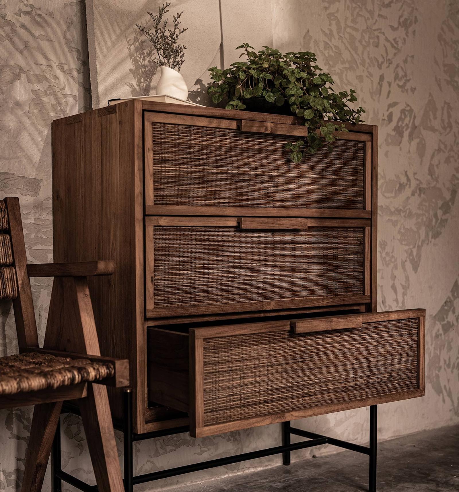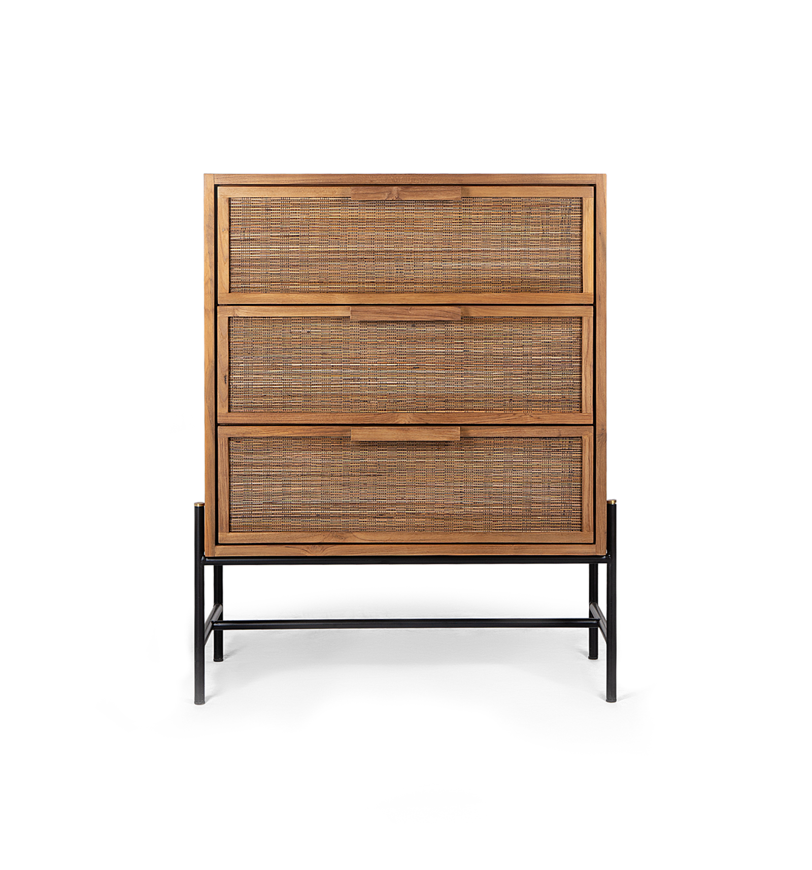 Het kleine Coco Dressoir is een meesterwerk van vakmanschap, vervaardigd uit gerecycled teakhout, stevig ijzer en handgemaakte weefsels van de middennerf van kokosnootpalmblaadjes. Dit dressoir is niet alleen een praktische oplossing met zijn drie ruime lades, maar ook een opvallend meubelstuk dat onmiddellijk de aandacht trekt. Het subtiele hoekdetail in het houten frame voegt een verfijnd designelement toe, wat het dressoir een unieke en stijlvolle uitstraling geeft. Perfect voor wie op zoek is naar een duurzame, tijdloze en functionele toevoeging aan hun interieur.