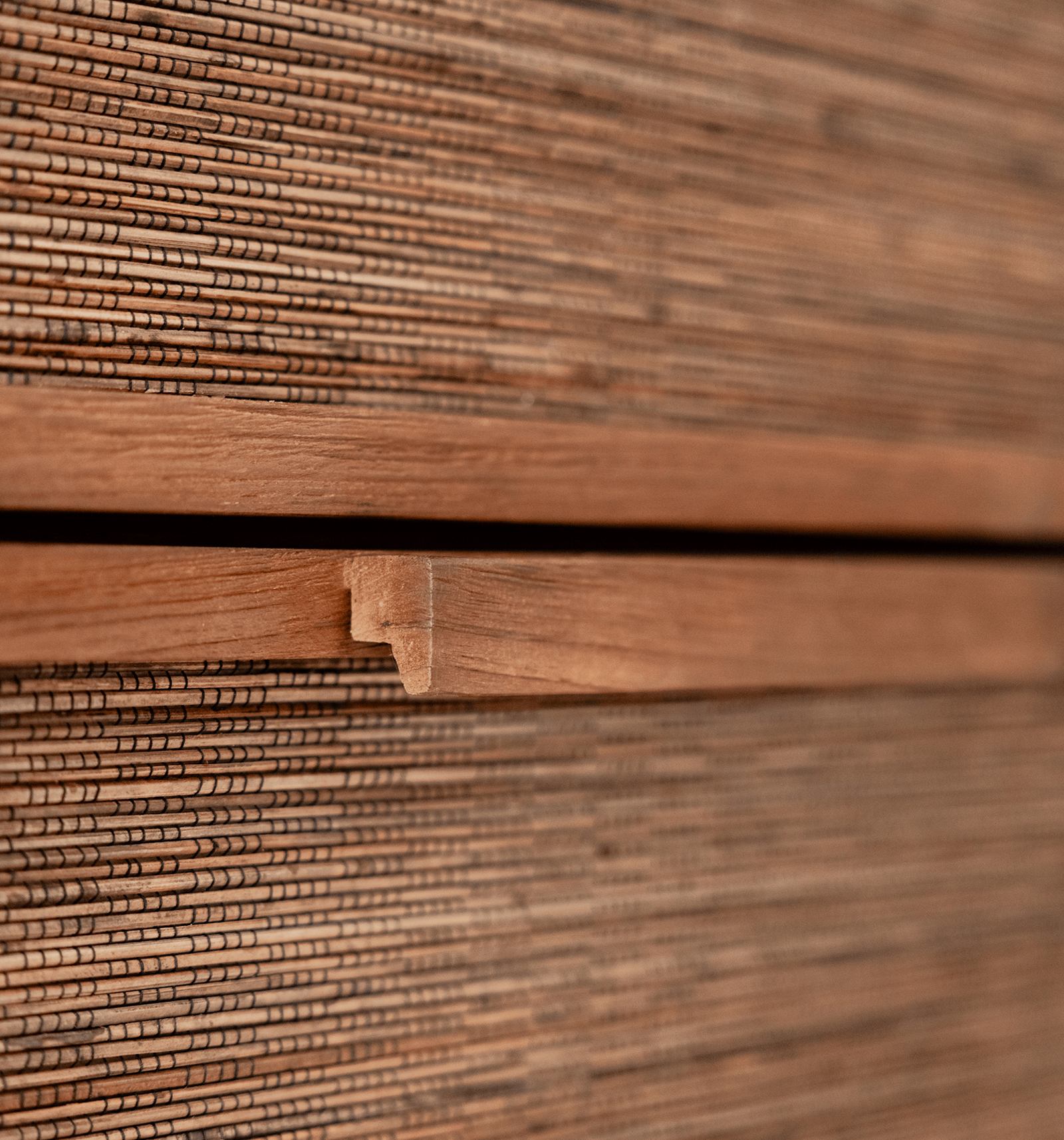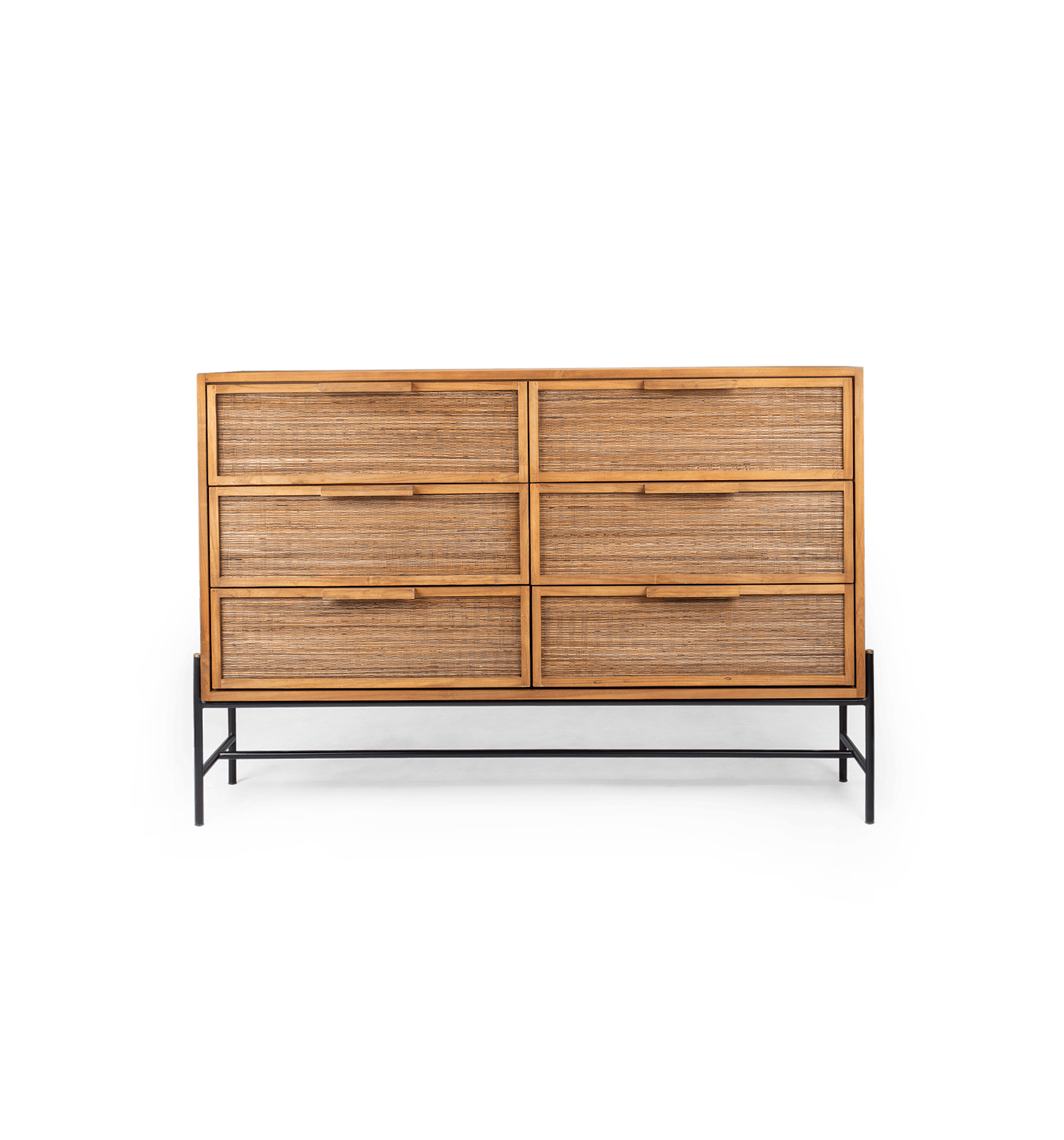 Het rechthoekige Coco Reus Dressoir is een werkelijk indrukwekkend meubelstuk dat vakmanschap en stijl perfect combineert. Gemaakt van gerecycled teakhout, robuust ijzer en handgemaakte weefsels van de middennerf van kokosnootpalmblaadjes, trekt dit dressoir direct de aandacht en voegt het een vleugje natuurlijke charme toe aan uw interieur. Met zes ruime lades biedt het volop opbergruimte, waardoor het zowel praktisch als veelzijdig is. Het subtiele hoekdetail in het houten frame zorgt voor een unieke uitstraling die dit dressoir tot een echte blikvanger maakt. Perfect voor wie op zoek is naar een elegante en functionele toevoeging aan hun ruimte.