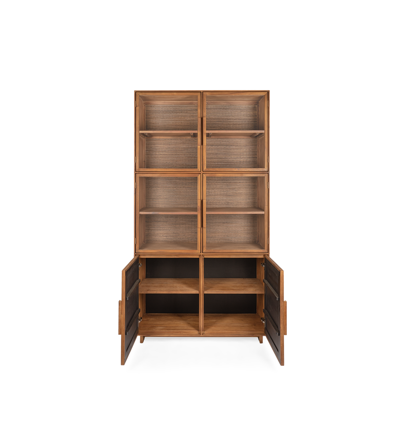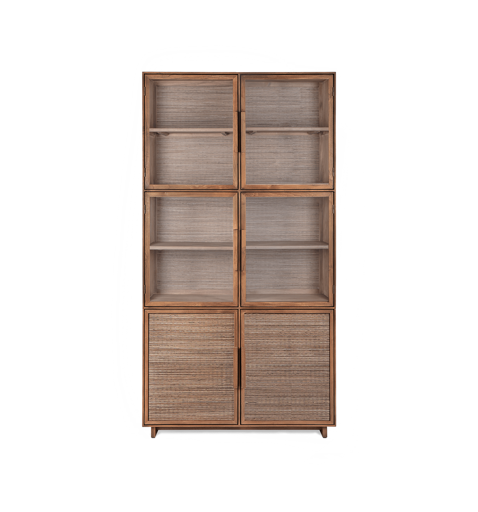 Met zijn slanke, verfijnde lijnen is deze vitrine een ware blikvanger die zowel praktisch als visueel aantrekkelijk is. De glazen deuren, omlijst met prachtig teak en afgewerkt met subtiele ingewerkte randen en elegante teakhendels, vormen een harmonieuze combinatie met de handgeweven deuren, bedekt met kokosnootmiddenschors. Dit stijlvolle meubelstuk voegt een vleugje luxe en natuurlijke charme toe aan elke ruimte, en is de perfecte aanvulling op diverse interieurstijlen.