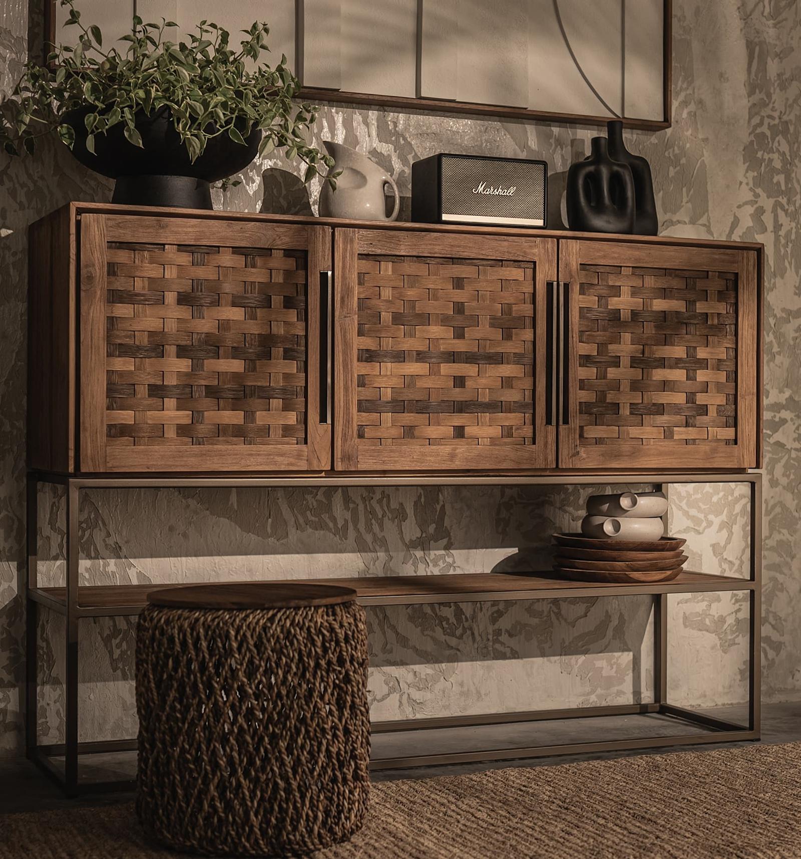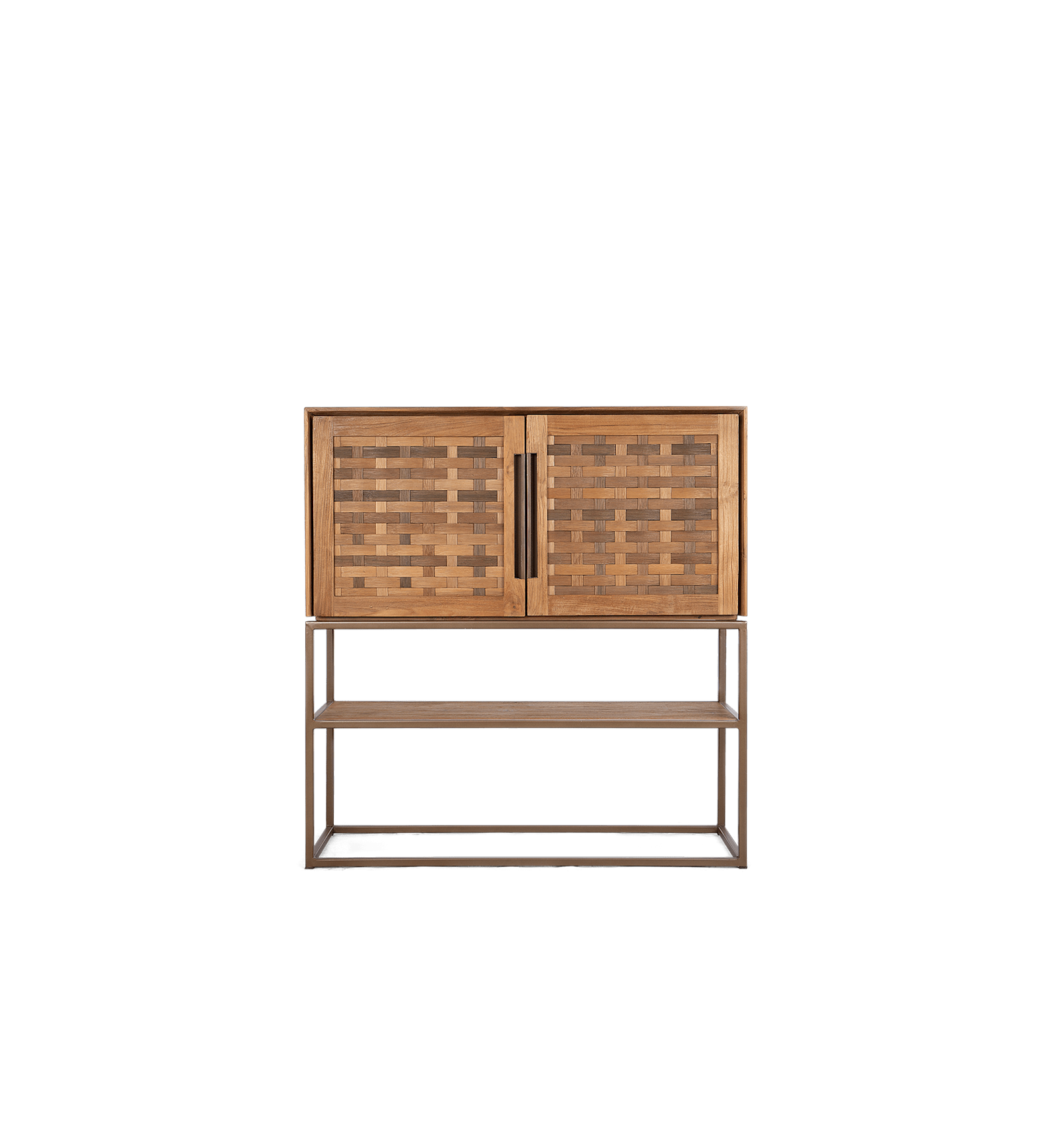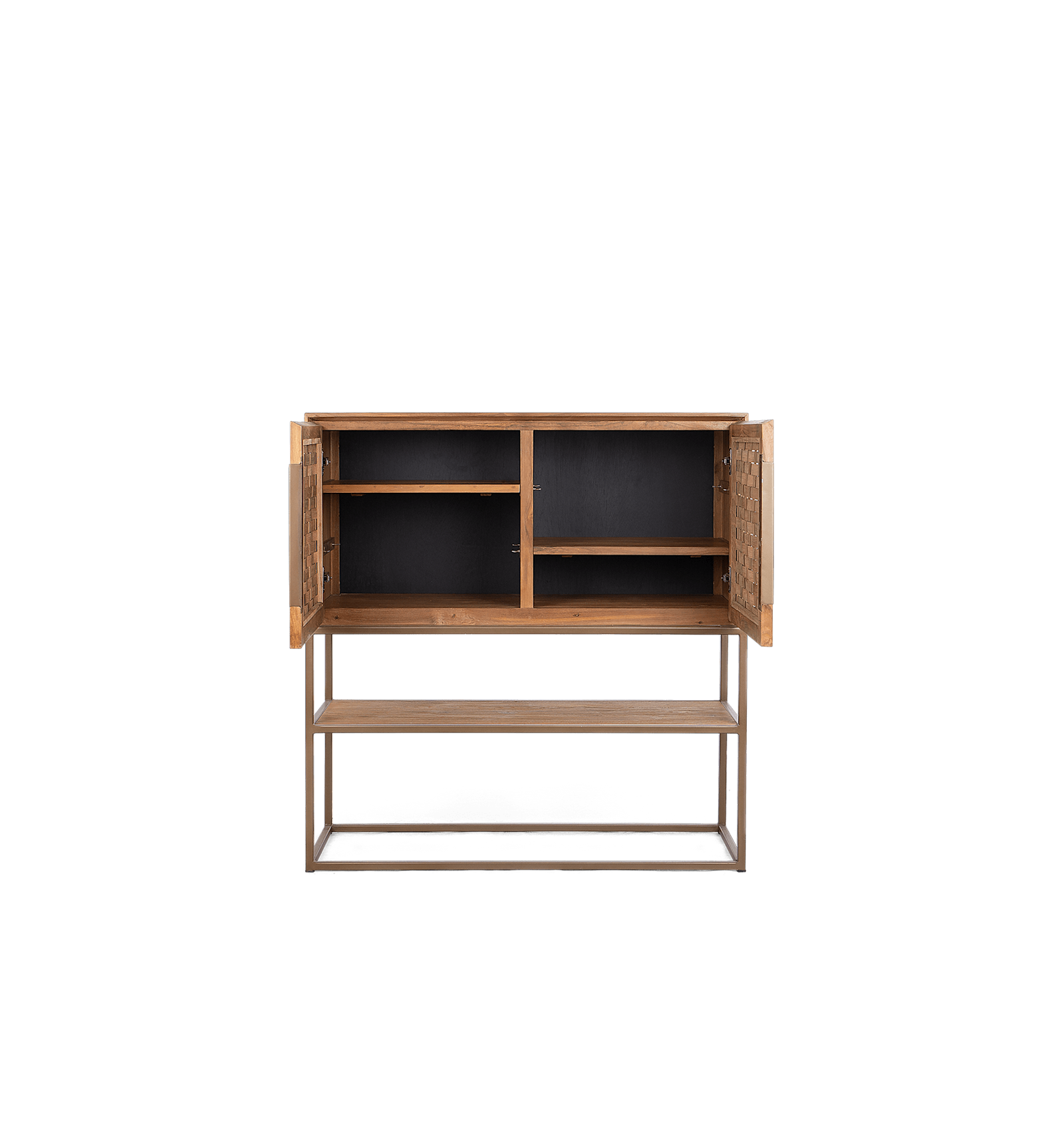 De Karma Pure Hoge Ladekast is een tijdloos meubelstuk dat vakmanschap en elegantie combineert. Handgemaakt van duurzaam gerecycled teakhout, bamboe en ijzer, straalt deze kast een verfijnde vintage charme uit. De twee prachtig gestructureerde bamboe deuren verbergen vier verstelbare planken, waardoor je opbergruimte op maat hebt voor je spullen. Het onderste rek is ideaal voor het tentoonstellen van je mooiste boeken of decoratieve items. Het ijzeren frame met matte messing afwerking voegt een luxe, moderne touch toe. Een perfect balans van stijl, functionaliteit en duurzaamheid voor elk interieur.