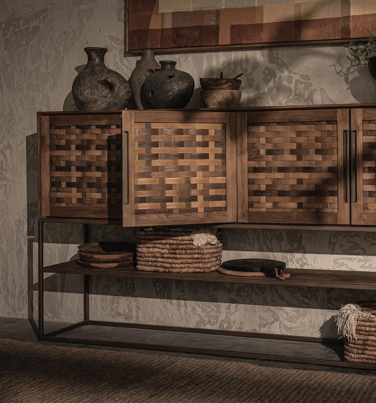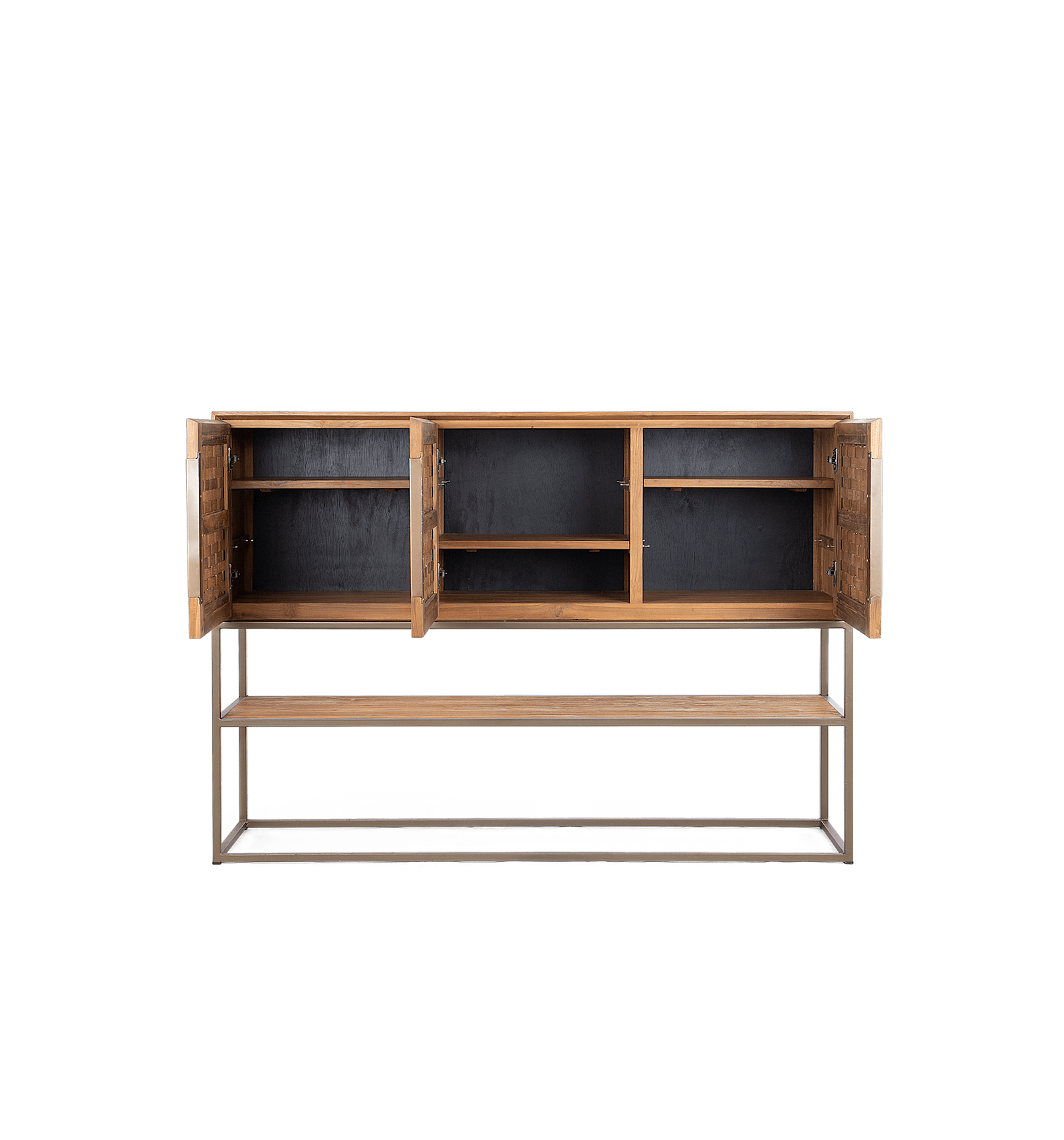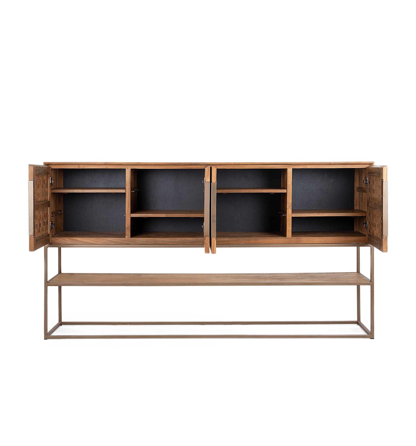 De Karma Pure Hoge Ladekast is een tijdloos meubelstuk dat vakmanschap en elegantie combineert. Handgemaakt van duurzaam gerecycled teakhout, bamboe en ijzer, straalt deze kast een verfijnde vintage charme uit. De twee prachtig gestructureerde bamboe deuren verbergen vier verstelbare planken, waardoor je opbergruimte op maat hebt voor je spullen. Het onderste rek is ideaal voor het tentoonstellen van je mooiste boeken of decoratieve items. Het ijzeren frame met matte messing afwerking voegt een luxe, moderne touch toe. Een perfect balans van stijl, functionaliteit en duurzaamheid voor elk interieur.