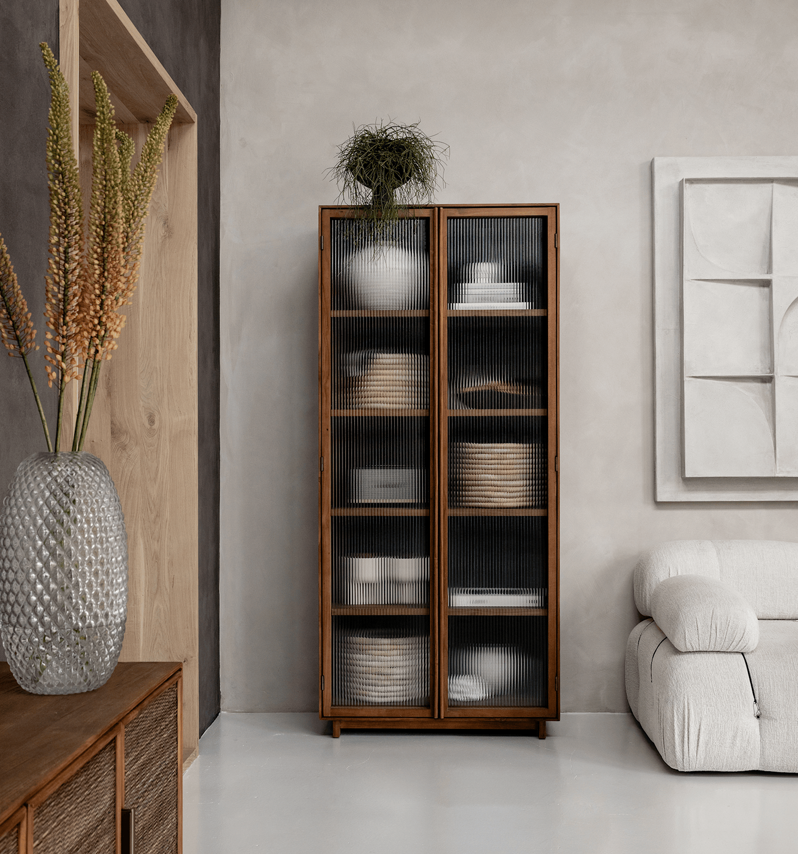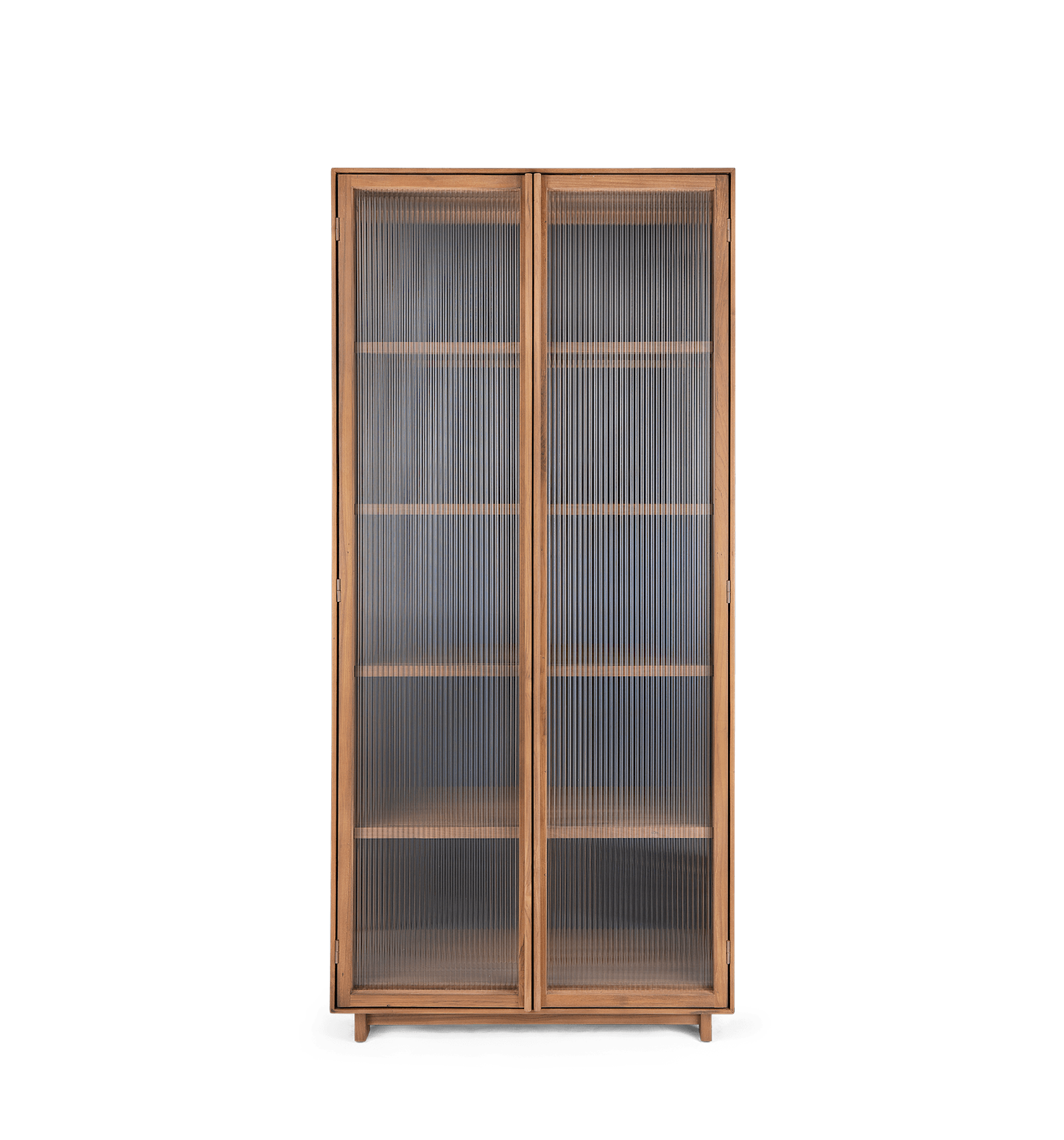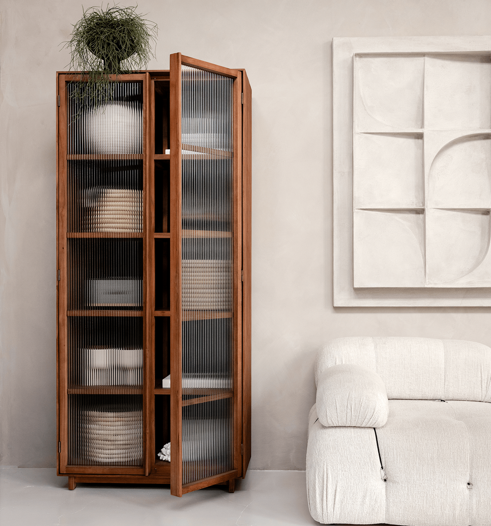 De Motion Vitrinekast is een waar statement in elk interieur. De prachtige full-length, verticaal geflutteerde lenticulaire glazen deuren creëren een betoverend visueel effect, waardoor de objecten binnenin op een unieke manier tot leven komen. Het teak frame, met zorgvuldig verzonken randen en elegante teak handgrepen, benadrukt het vakmanschap en de tijdloze schoonheid van dit meubel. Een meesterwerk dat niet alleen functioneert als opbergplek, maar ook als een adembenemend visueel middelpunt in je ruimte.