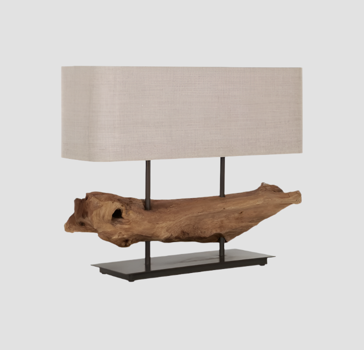 De lampenvoet is gemaakt van echte teakboomwortels, die stuk voor stuk met de hand worden geselecteerd en verwerkt. Geen enkele voet is gelijk, en juist de onregelmatigheden, scheurtjes en lijnen geven deze lamp zijn karakter en charme. Het zwarte stalen frame voegt een stoer, industrieel element toe, terwijl de natuurlijke linnen kap zorgt voor een warme, zachte lichtval.