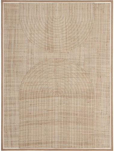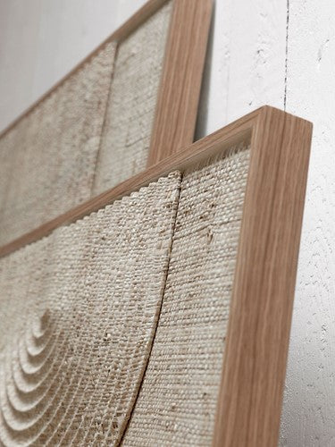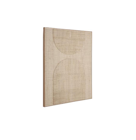 Met afmetingen van 102 x 76 x 4 cm en 127 x 102 x 4 cm is het een opvallende toevoeging aan elke muur, zonder te overweldigen. Het gebruik van natuurlijk materiaal zorgt voor een warme, organische uitstraling die het geheel een rustgevende, tijdloze charme geeft.