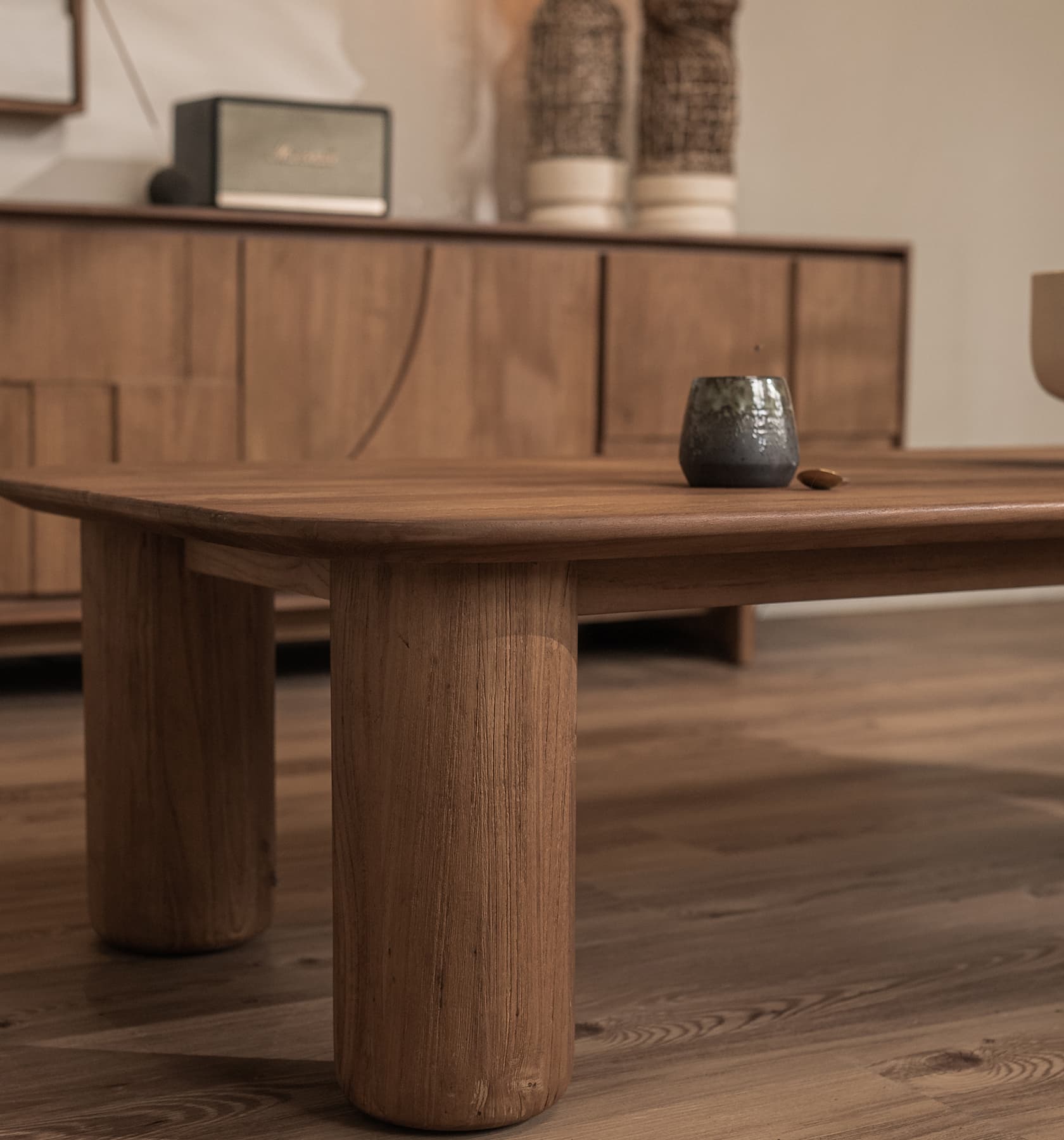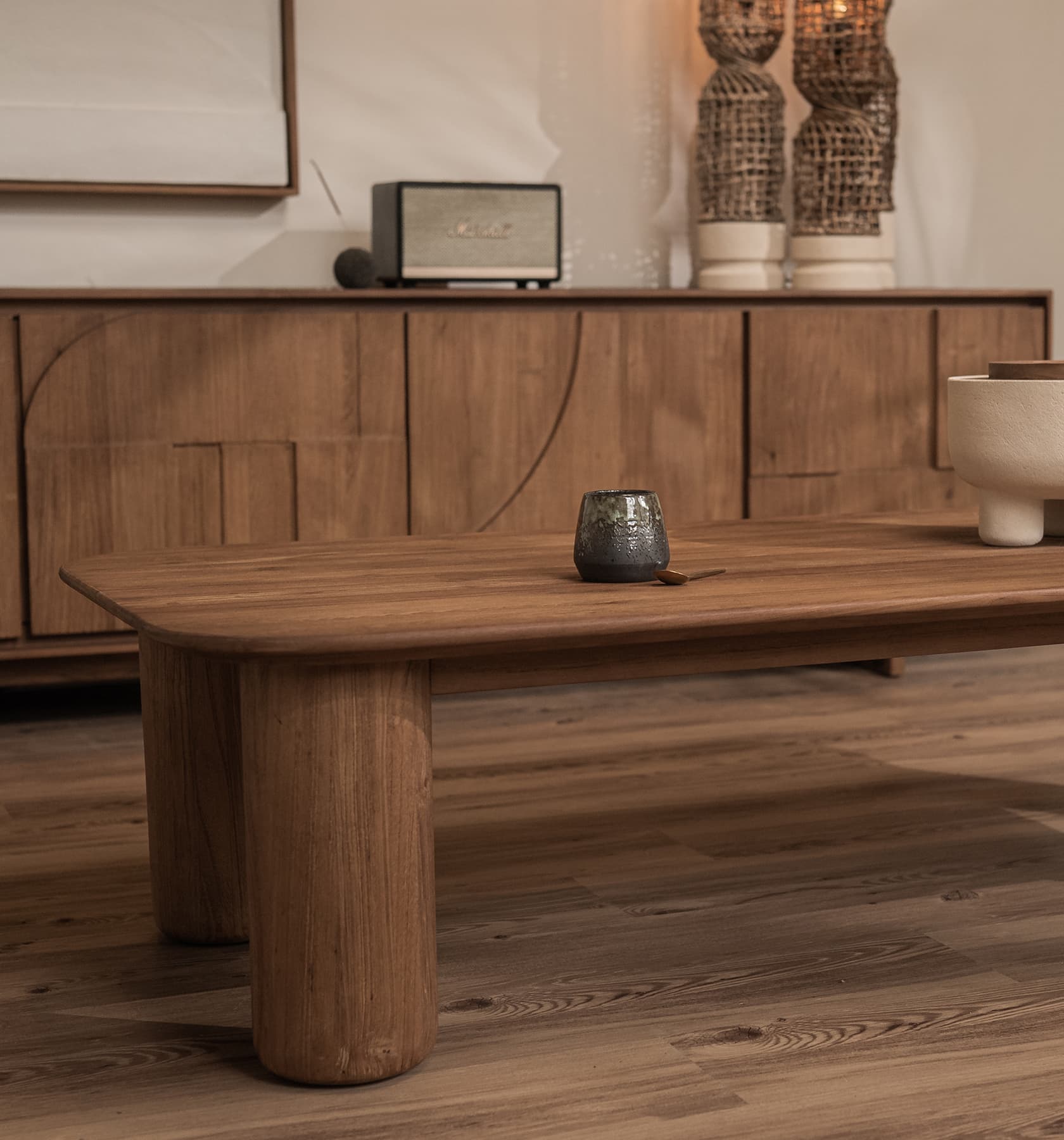 De Dino Salontafel, verkrijgbaar in twee stijlvolle maten, is een echte eyecatcher in elke ruimte. Gemaakt van gerecycled teakhout, combineert de tafel elegantie met praktische details, zoals de verfijnde afgeschuinde en gebogen randen. De stevige, gedraaide voetstukpoten bieden een solide basis. De minimalistische afwerking van het hout geeft deze tafels een warme, 'geleefde' rustieke charme, waardoor ze niet alleen functioneel zijn, maar ook een karaktervolle toevoeging aan je interieur vormen.