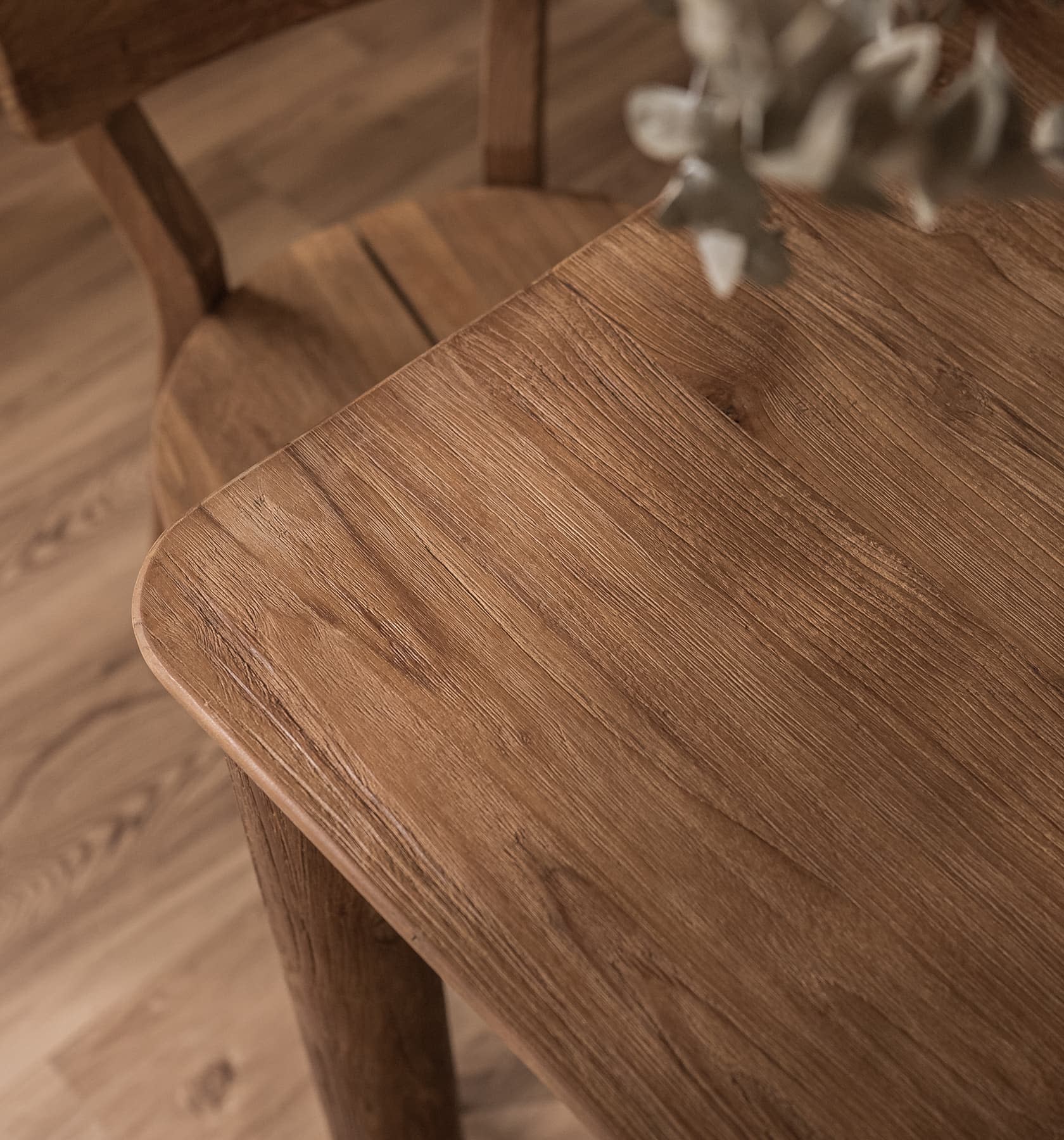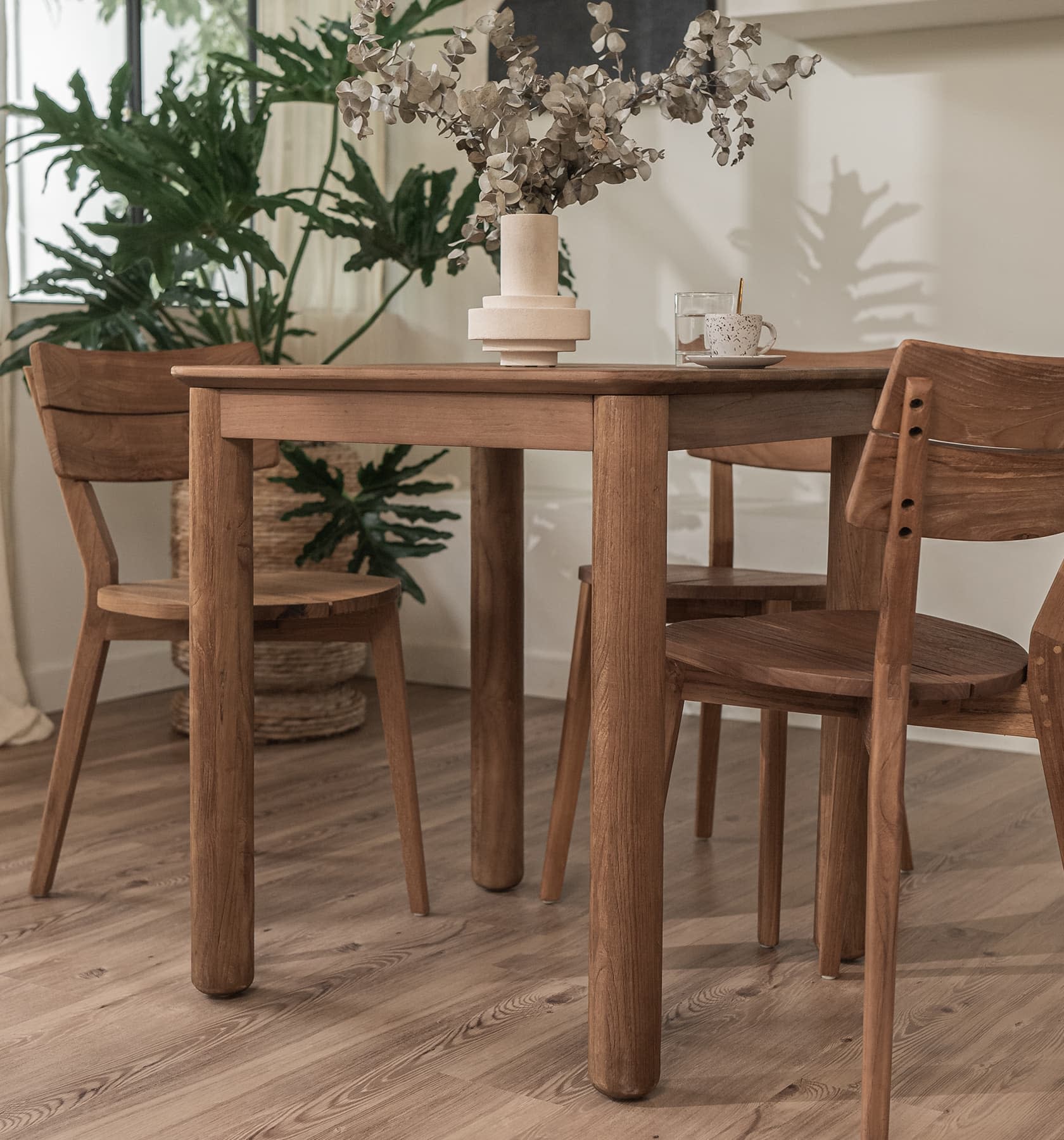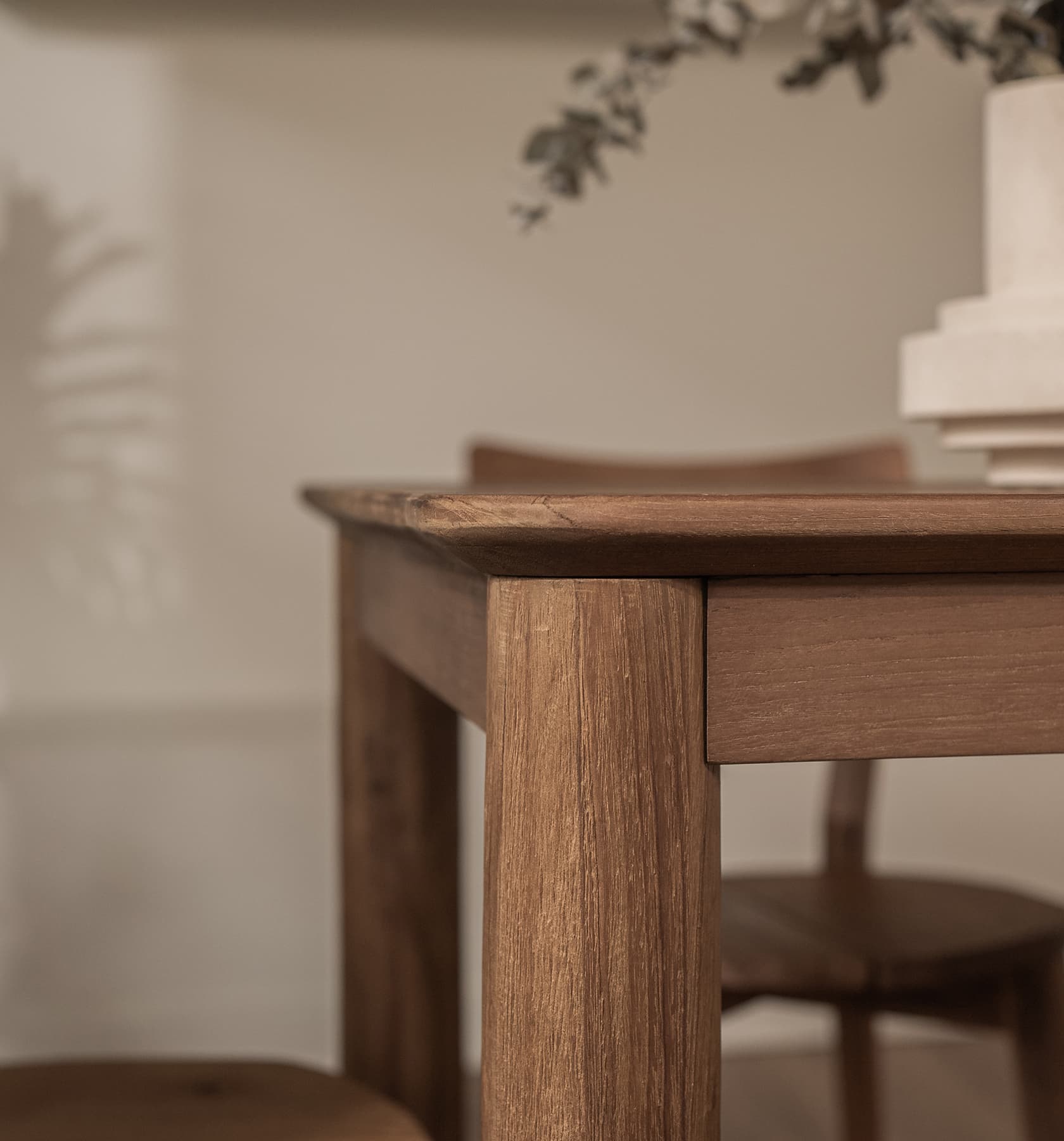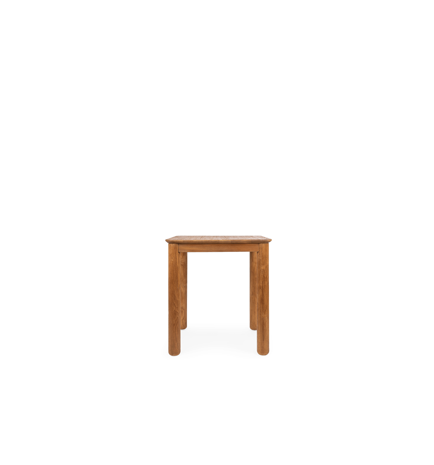 De Dino Vierkante Eettafel is de perfecte keuze voor kleinere ruimtes waar stijl en functionaliteit samenkomen. Vervaardigd uit gerecycled teakhout, heeft de tafel elegante afgeschuinde en gebogen randen die niet alleen praktisch zijn, maar ook een verfijnd accent toevoegen. De stevige, gedraaide voetstukpoten zorgen voor stabiliteit en een tijdloze uitstraling. De subtiele afwerking van het hout geeft de tafel een warme, ‘geleefde’ rustieke charme, waardoor hij zowel praktisch als karaktervol is. Een ideale toevoeging voor wie op zoek is naar een tafel die zowel stijlvol als veelzijdig is