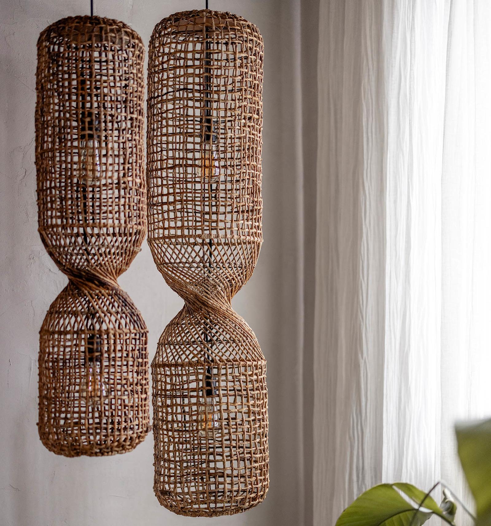 De Twister Koi lampenkappen zijn een prachtig voorbeeld van vakmanschap, geïnspireerd door de vorm van een ‘vissentrap’. Het open metalen frame is vakkundig gewikkeld in Abacabast, wat zorgt voor een rustieke, natuurlijke uitstraling. De lampenkappen zijn elegant samengeperst en gedraaid, waarbij stijlvolle 'draaidetails' zichtbaar worden. Gecompleteerd met een verfijnde afwerking van handgedraaid gerecupereerd teak, is deze lamp een ware eyecatcher die charme en warmte toevoegt aan elke ruimte.